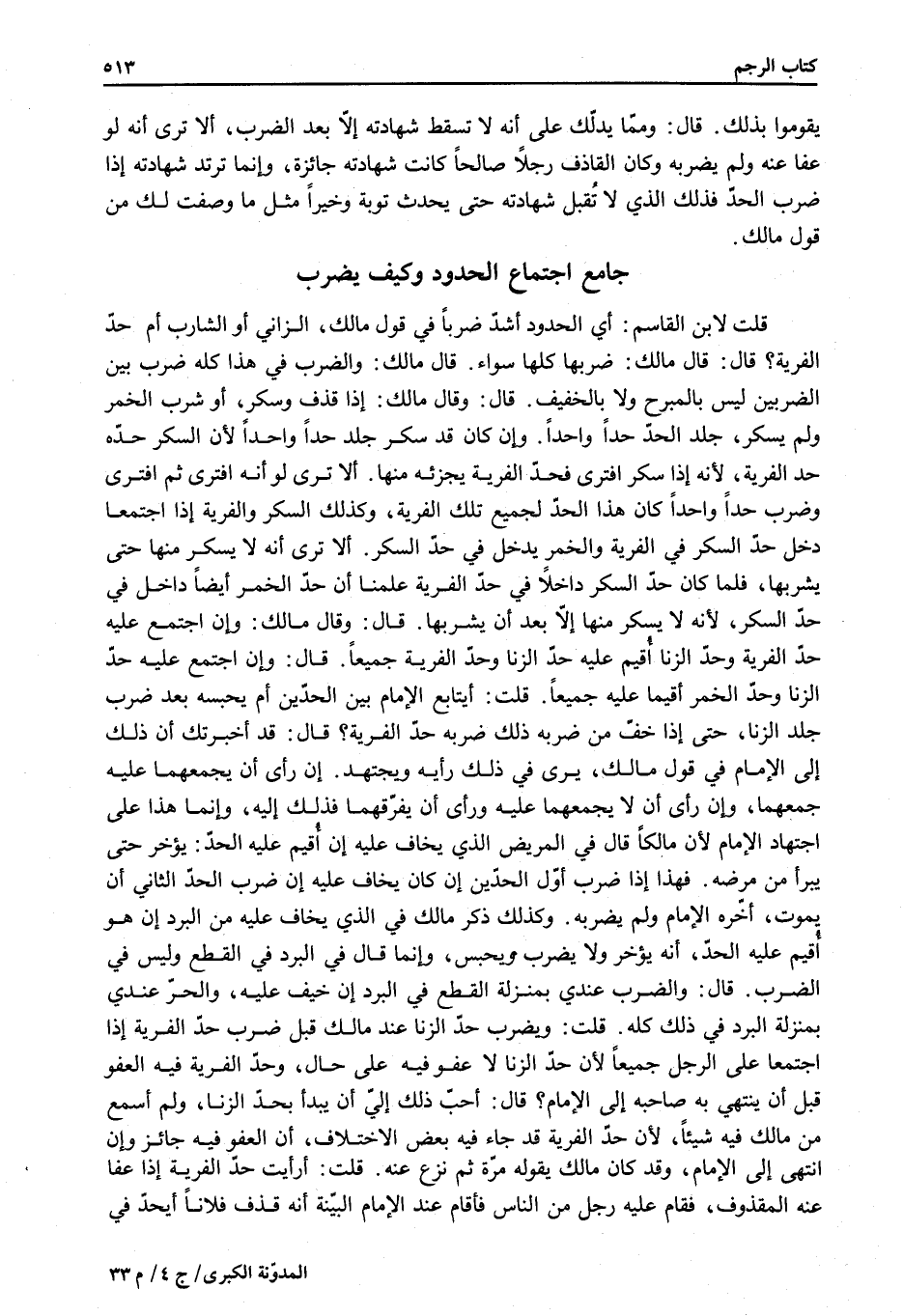 ُ قُلْتُ لِابْنِ الْقَاسِمِ: أَيُّ الْحُدُودِ أَشَدُّ ضَرْبًا فِي قَوْلِ مَالِكٍ الزَّانِي أَوْ الشَّارِبُ أَمْ حَدُّ الْفِرْيَةِ؟ قَالَ: قَالَ مَالِكٌ: ضَرْبُهَا كُلِّهَا سَوَاءٌ.