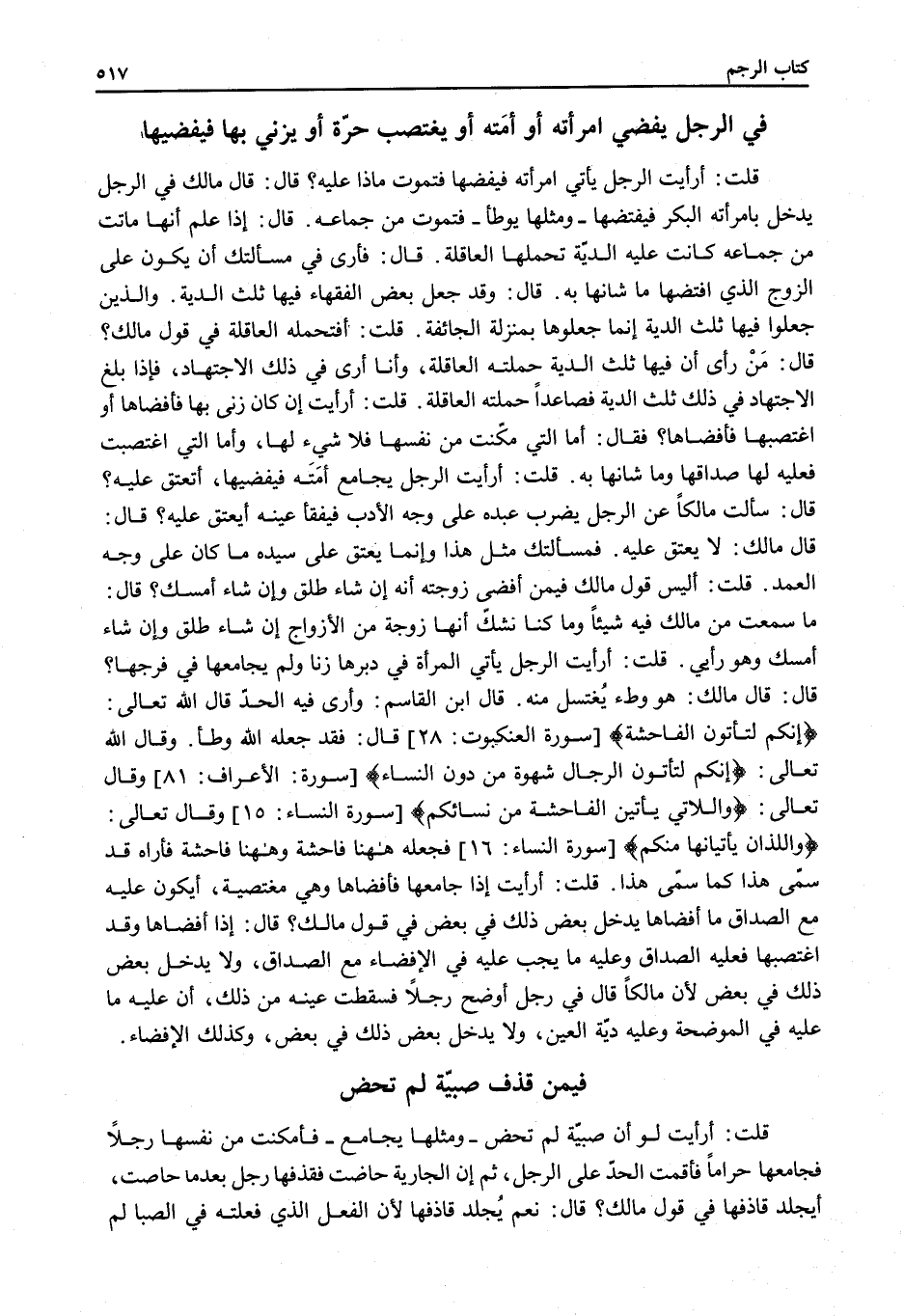 ْ قُلْتُ: أَرَأَيْتَ لَوْ أَنَّ صَبِيَّةً لَمْ تَحِضْ وَمِثْلُهَا يُجَامَعُ فَأَمْكَنَتْ مِنْ نَفْسِهَا رَجُلًا فَجَامَعَهَا حَرَامًا فَأَقَمْتُ الْحَدَّ عَلَى الرَّجُلِ، ثُمَّ إنَّ الْجَارِيَةَ حَاضَتْ فَقَذَفَهَا رَجُلٌ بَعْدَمَا حَاضَتْ، أَيُجْلَدُ قَاذِفُهَا فِي قَوْلِ مَالِكٍ؟