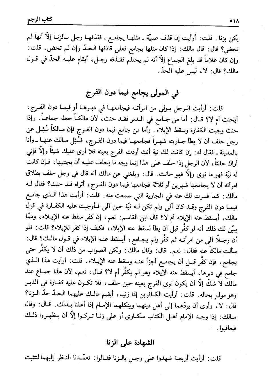 ِ قُلْتُ: أَرَأَيْتَ الرَّجُلَ يُولِي مِنْ امْرَأَتِهِ فَيُجَامِعُهَا فِي دُبُرِهَا أَوْ فِيمَا دُونَ الْفَرْجِ، أَيَحْنَثُ أَمْ لَا؟ قَالَ: أَمَّا مَنْ جَامَعَ فِي الدُّبُرِ فَقَدْ حَنِثَ، لِأَنَّ مَالِكًا جَعَلَهُ جِمَاعًا. وَإِذَا حَنِثَ وَجَبَتْ الْكَفَّارَةُ وَسَقَطَ الْإِيلَاءُ. وَأَمَّا مَنْ جَامَعَ فِيمَا دُونَ الْفَرْجِ فَإِنَّ مَالِكًا سُئِلَ عَنْ رَجُلٍ حَلَفَ أَنْ لَا يَطَأَ جَارِيَتَهُ شَهْرًا فَجَامَعَهَا فِيمَا دُونَ الْفَرْجِ، فَسُئِلَ عَنْهَا مَالِكٌ وَأَنَا بِالْمَدِينَةِ فَقَالَ لَهُ: إنْ كَانَتْ لَك نِيَّةٌ أَنَّك أَرَدْتَ الْفَرْجَ بِعَيْنِهِ فَلَا أَرَى عَلَيْك شَيْئًا وَإِلَّا فَإِنِّي أَرَاك حَانِثًا، لِأَنَّ الرَّجُلَ إذَا حَلَفَ عَلَى هَذَا إنَّمَا وَجْهُ مَا يَحْلِفُ عَلَيْهِ أَنْ يَجْتَنِبَهَا، فَإِنْ كَانَتْ لَهُ نِيَّةٌ فَهُوَ مَا نَوَى وَإِلَّا فَهُوَ حَانِثٌ. قَالَ: وَبَلَغَنِي عَنْ مَالِكٍ أَنَّهُ قَالَ فِي رَجُلٍ حَلَفَ بِطَلَاقِ امْرَأَتِهِ أَنْ لَا يُجَامِعَهَا شَهْرَيْنِ أَوْ ثَلَاثَةً فَجَامَعَهَا فِيمَا دُونَ الْفَرْجِ، أَتَرَاهُ قَدْ حَنِثَ؟ فَقَالَ لَهُ مَالِكٌ: كَمَا فَسَّرْتُ لَكَ عَنْهُ فِي الْجَارِيَةِ الَّتِي سَمِعْتُ مِنْهُ.