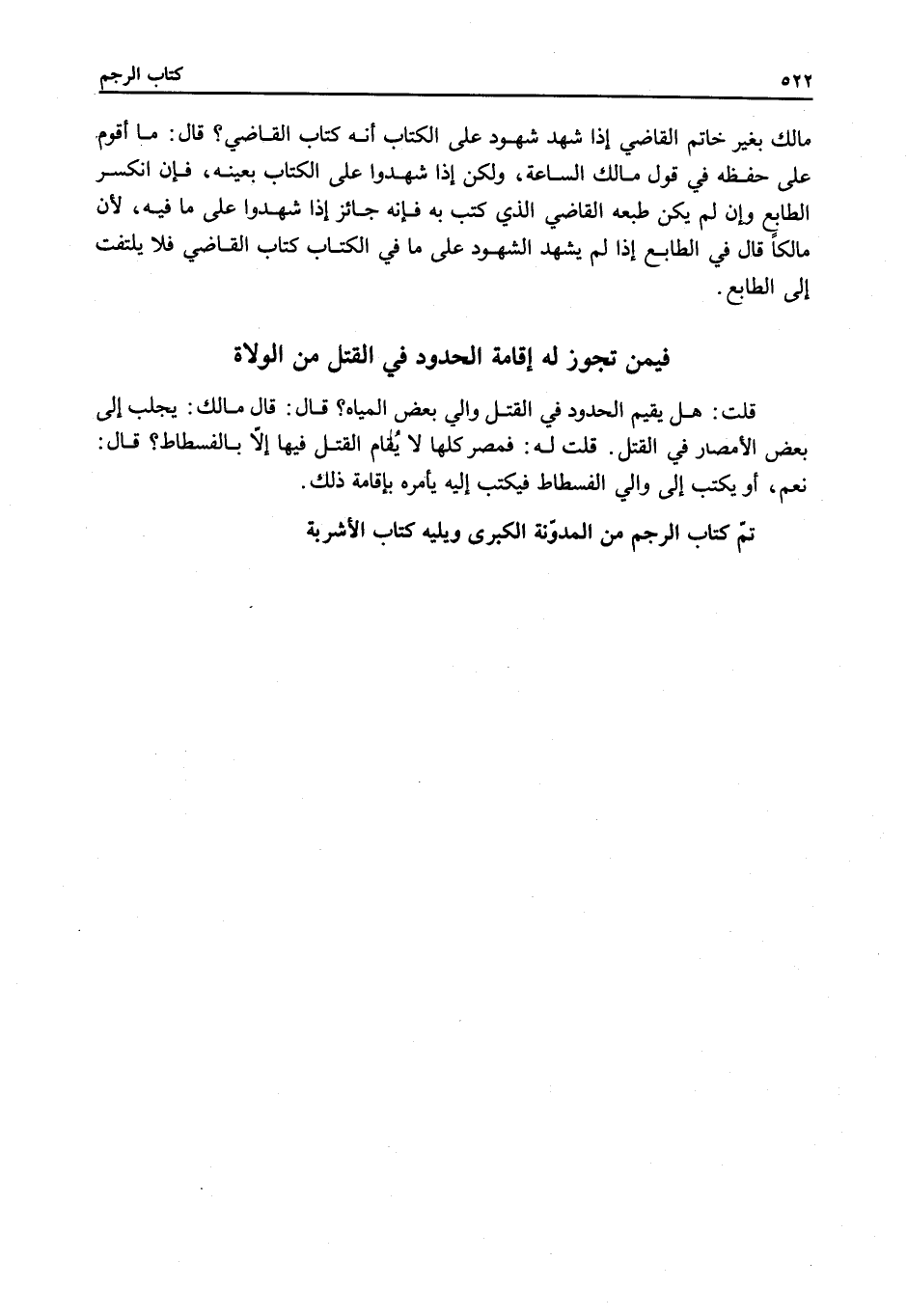 قَالَ: نَعَمْ، أَوْ يَكْتُبُ إلَى وَالِي الْفُسْطَاطِ فَيَكْتُبُ إلَيْهِ يَأْمُرُهُ بِإِقَامَةِ ذَلِكَ. تَمَّ كِتَابُ الرَّجْمِ مِنْ الْمُدَوَّنَةِ الْكُبْرَى وَيَلِيه كِتَابُ الْأَشْرِبَةِ