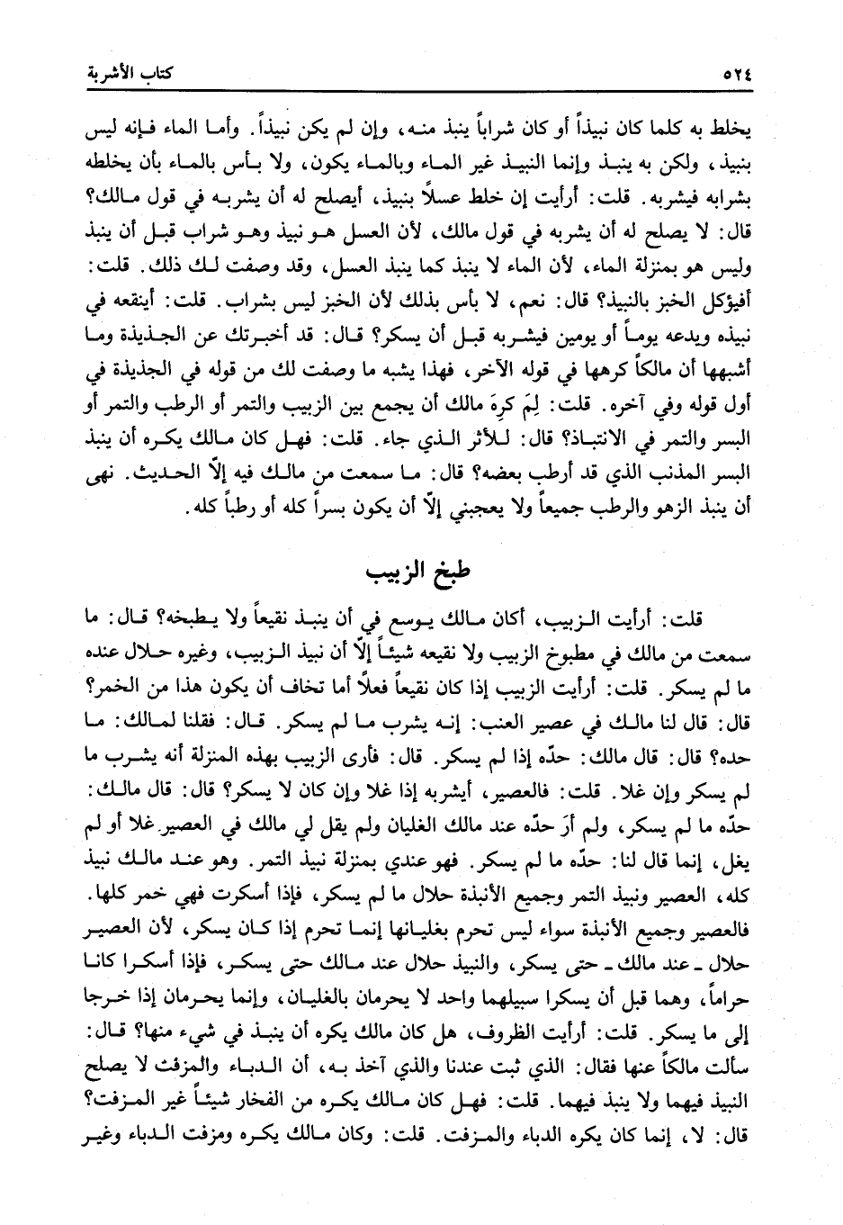 ِ قُلْتُ: أَرَأَيْتَ الزَّبِيبَ، أَكَانَ مَالِكٌ يُوَسِّعُ فِي أَنْ يُنْبَذَ نَقِيعًا وَلَا يَطْبُخُهُ؟ قَالَ: مَا سَمِعْتُ مِنْ مَالِكٍ فِي مَطْبُوخِ الزَّبِيبِ وَلَا نَقِيعِهِ شَيْئًا إلَّا أَنَّ نَبِيذَ الزَّبِيبِ، وَغَيْرَهُ حَلَالٌ عِنْدَهُ مَا لَمْ يُسْكِرْ.