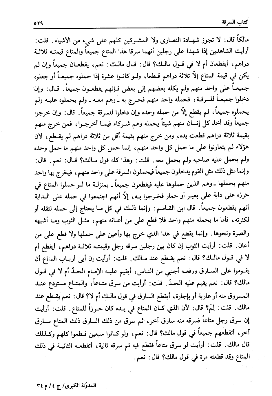 قُلْتُ أَرَأَيْتَ إنْ سَرَقَ رَجُلٌ مَتَاعًا فَسَرَقَهُ مِنْهُ سَارِقٌ آخَرُ، ثُمَّ سَرَقَ مِنْ ذَلِكَ السَّارِقِ ذَلِكَ الْمَتَاعَ سَارِقٌ آخَرُ، أَتَقْطَعُهُمْ جَمِيعًا فِي قَوْلِ مَالِكٍ؟