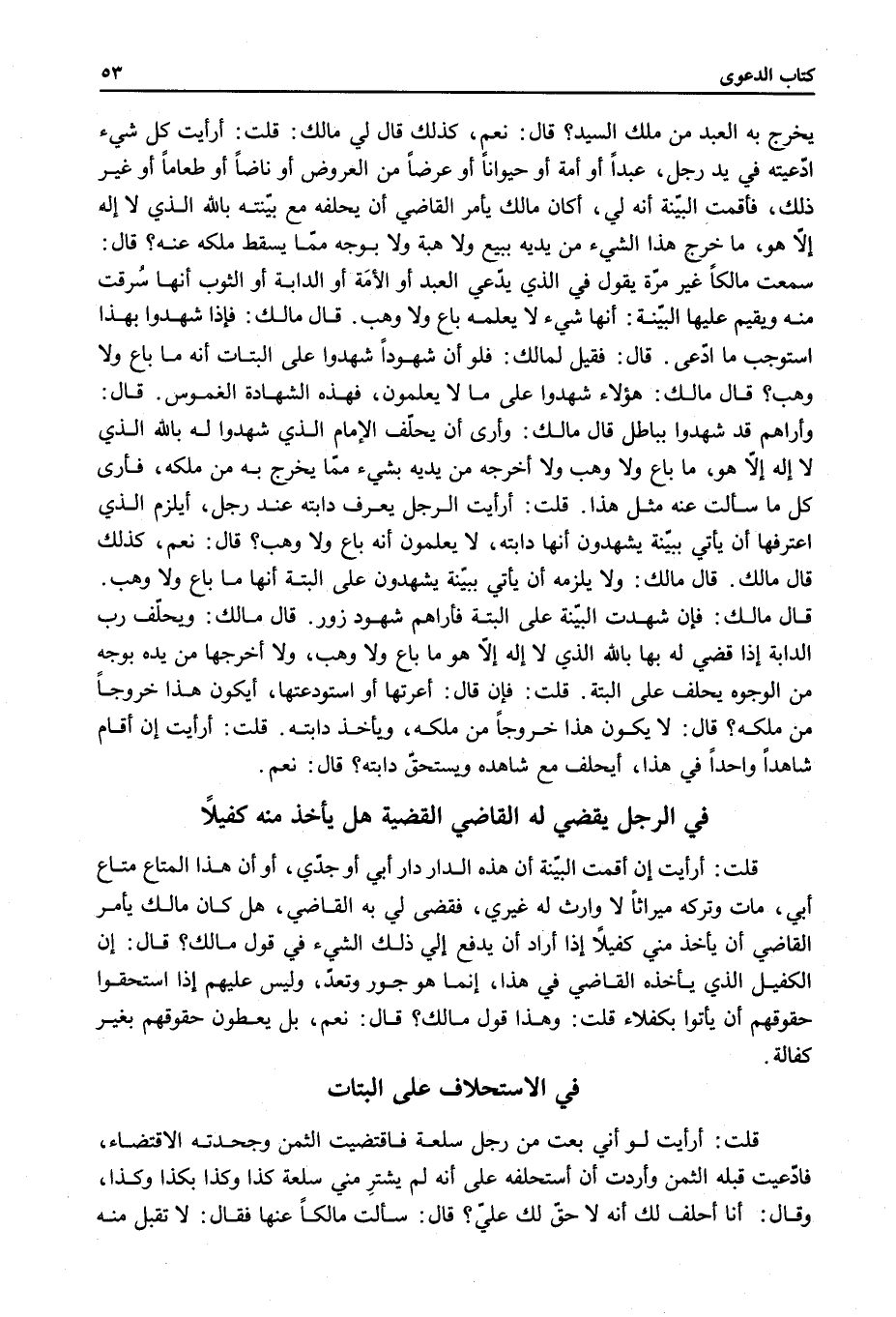 قُلْتُ: أَرَأَيْتَ إنْ أَقَمْت الْبَيِّنَةَ أَنَّ هَذِهِ الدَّارَ دَارُ أَبِي أَوْ جَدِّي، أَوْ أَنَّ هَذَا الْمَتَاعَ مَتَاعُ أَبِي، مَاتَ وَتَرَكَهُ مِيرَاثًا لَا وَارِثَ لَهُ غَيْرِي، فَقَضَى لِي بِهِ الْقَاضِي، هَلْ كَانَ مَالِكٌ يَأْمُرُ الْقَاضِيَ أَنْ يَأْخُذَ مِنِّي كَفِيلًا إذَا أَرَادَ أَنْ يَدْفَعَ إلَيَّ ذَلِكَ الشَّيْءَ فِي قَوْلِ مَالِكٍ؟