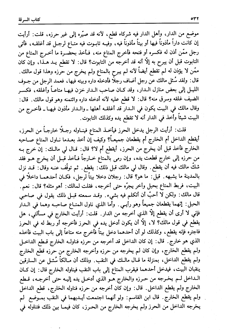 قُلْتُ: أَرَأَيْتَ الرَّجُلَ يَدْخُلُ الْحِرْزَ فَيَأْخُذُ الْمَتَاعَ فَيُنَاوِلُهُ رَجُلًا خَارِجًا مِنْ الْحِرْزِ، أَيُقْطَعُ الدَّاخِلُ أَمْ الْخَارِجُ أَمْ يُقْطَعَانِ جَمِيعًا؟ وَكَيْفَ إنْ أُخِذَ بَعْدَمَا نَاوَلَ الْمَتَاعَ صَاحِبَهُ الْخَارِجَ فَأُخِذَ قَبْلَ أَنْ يَخْرُجَ مِنْ الْحِرْزِ، أَيُقْطَعُ أَمْ لَا؟ قَالَ: قَالَ لِي مَالِكٌ: إنْ خَرَجَ بِهِ مِنْ حِرْزِهِ إلَى خَارِجٍ قُطِعَتْ يَدُهُ، وَإِنْ رَمَى بِالْمَتَاعِ خَارِجًا فَأُخِذَ قَبْلَ أَنْ يَخْرُجَ هُوَ فَقَدْ شَكَّ مَالِكٌ فِيهِ أَنْ يُقْطَعَ. وَقَالَ لِي مَالِكٌ قَبْلَ ذَلِكَ: يُقْطَعُ. ثُمَّ تَوَقَّفَ عَنْهُ وَقَالَ: قَدْ نَزَلَ بِالْمَدِينَةِ مَا يُشْبِهُهُ. قِيلَ: مَا هُوَ؟