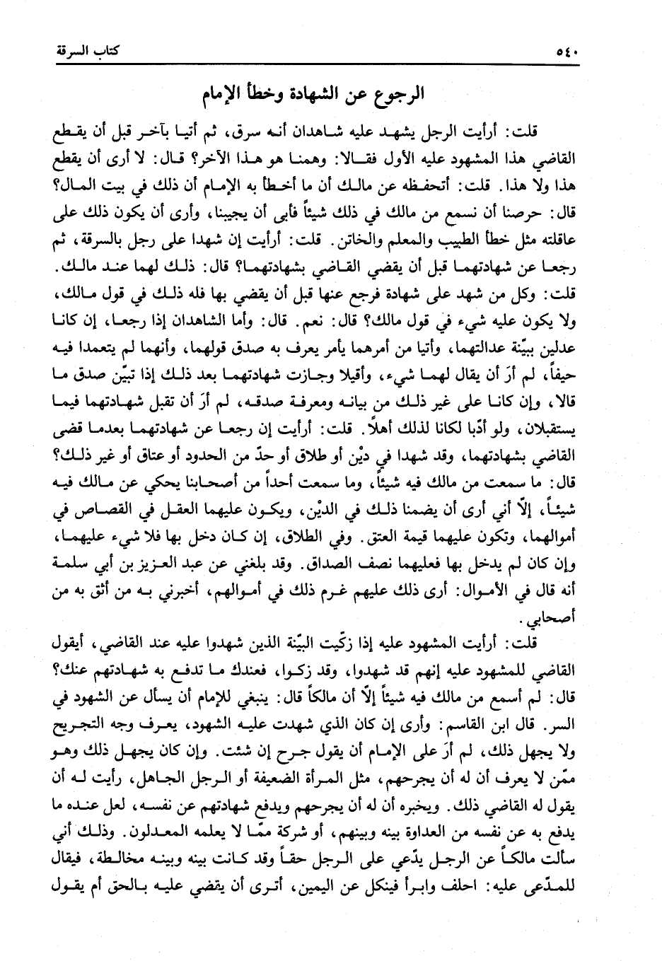 ِ قُلْتُ: أَرَأَيْتَ الرَّجُلَ يَشْهَدُ عَلَيْهِ شَاهِدَانِ أَنَّهُ سَرَقَ، ثُمَّ أَتَيَا بِآخَرَ قَبْلَ أَنْ يَقْطَع الْقَاضِي هَذَا الْمَشْهُودَ عَلَيْهِ الْأَوَّلَ فَقَالَا: وَهَمُّنَا هُوَ هَذَا الْآخَرُ؟ قَالَ لَا أَرَى أَنْ يُقْطَعَ هَذَا وَلَا هَذَا.