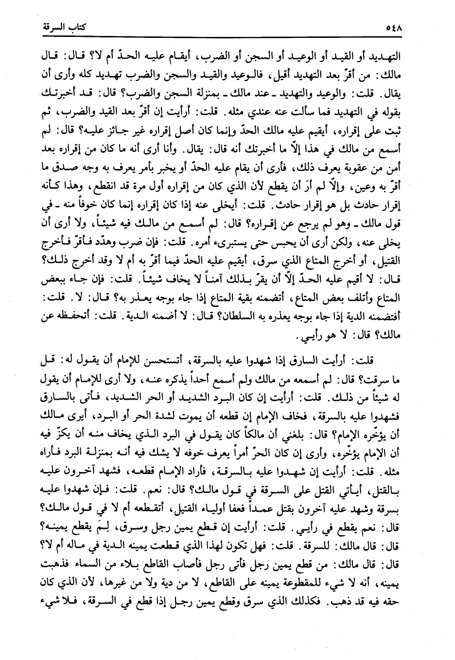 قُلْت: أَرَأَيْت السَّارِقَ إذَا شَهِدُوا عَلَيْهِ بِالسَّرِقَةِ، أَتَسْتَحْسِنُ لِلْإِمَامِ أَنْ يَقُولَ لَهُ: قُلْ مَا سَرَقْتُ؟ قَالَ: لَمْ أَسْمَعْهُ مِنْ مَالِكٍ وَلَمْ أَسْمَعْ أَحَدًا يَذْكُرُهُ عَنْهُ، وَلَا أَرَى لِلْإِمَامِ أَنْ يَقُولَ لَهُ شَيْئًا مِنْ ذَلِكَ.