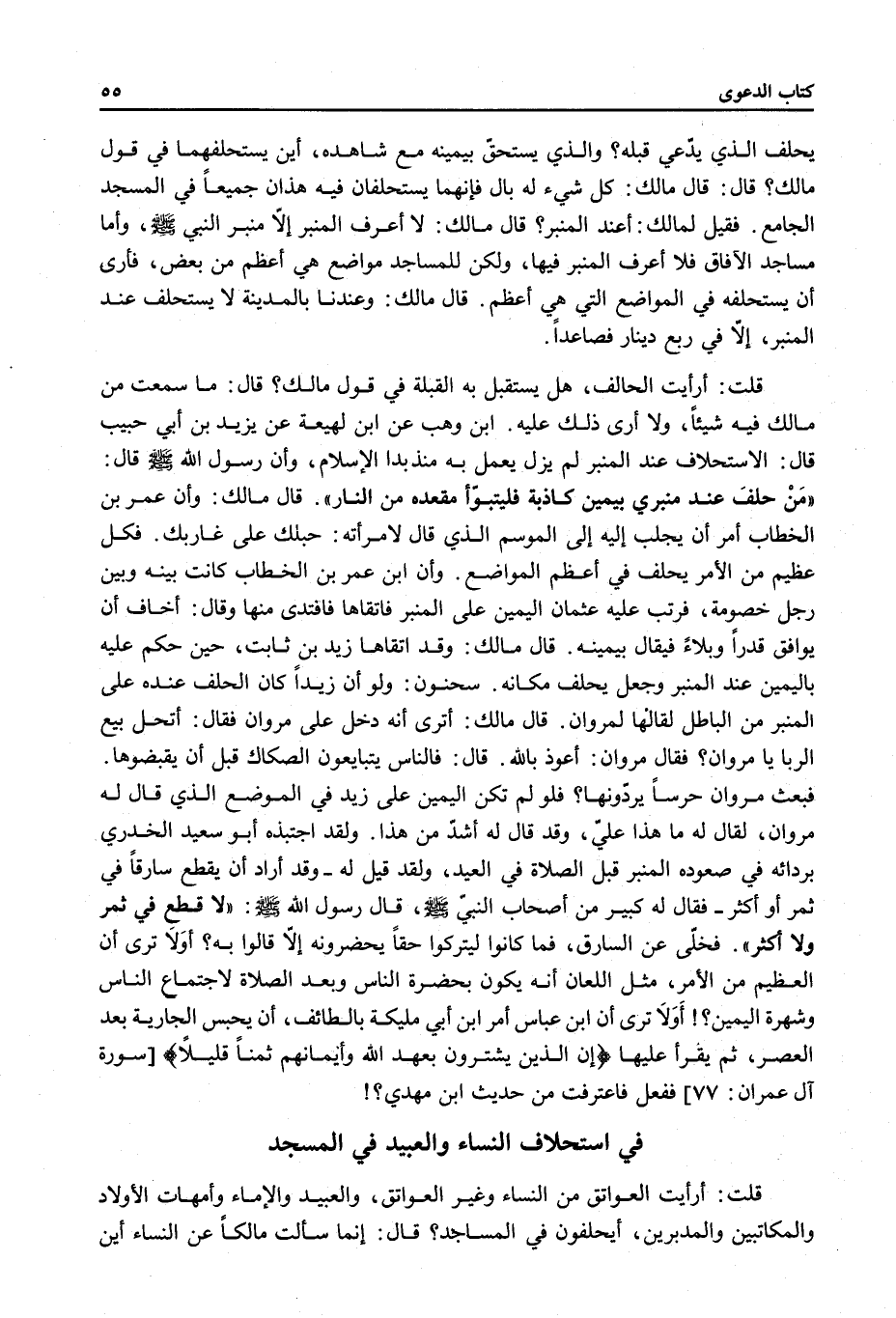 قَالَ مَالِكٌ: وَأَنَّ عُمَرَ بْنَ الْخَطَّابِ أَمَرَ أَنْ يُجْلَبَ إلَيْهِ إلَى الْمَوْسِمِ الَّذِي قَالَ لِامْرَأَتِهِ: حَبْلُكَ عَلَى غَارِبِكَ. فَكُلُّ عَظِيمٍ مِنْ الْأَمْرِ يُحْلَفُ فِي أَعْظَمِ الْمُوَاضِعِ. وَأَنَّ ابْنَ عُمَرَ بْنِ الْخَطَّابِ كَانَتْ بَيْنَهُ وَبَيْنَ رَجُلٍ خُصُومَةٌ، فَرَتَّبَ عَلَيْهِ عُثْمَانُ الْيَمِينَ عَلَى الْمِنْبَرِ فَاتَّقَاهَا فَافْتَدَى مِنْهَا وَقَالَ: أَخَافُ أَنْ يُوَافِقَ قَدَرًا وَبَلَاءً فَيُقَالُ: بِيَمِينِهِ. قَالَ مَالِكٌ: وَقَدْ اتَّقَاهَا زَيْدُ بْنُ ثَابِتٍ، حِينَ حُكِمَ عَلَيْهِ بِالْيَمِينِ عِنْدَ الْمِنْبَرِ وَجَعَلَ يَحْلِفُ مَكَانَهُ. سَحْنُونٌ: وَلَوْ أَنَّ زَيْدًا كَانَ الْحَلْفُ عِنْدَهُ عَلَى الْمِنْبَرِ مِنْ الْبَاطِلِ لَقَالَهَا لِمَرْوَانَ.