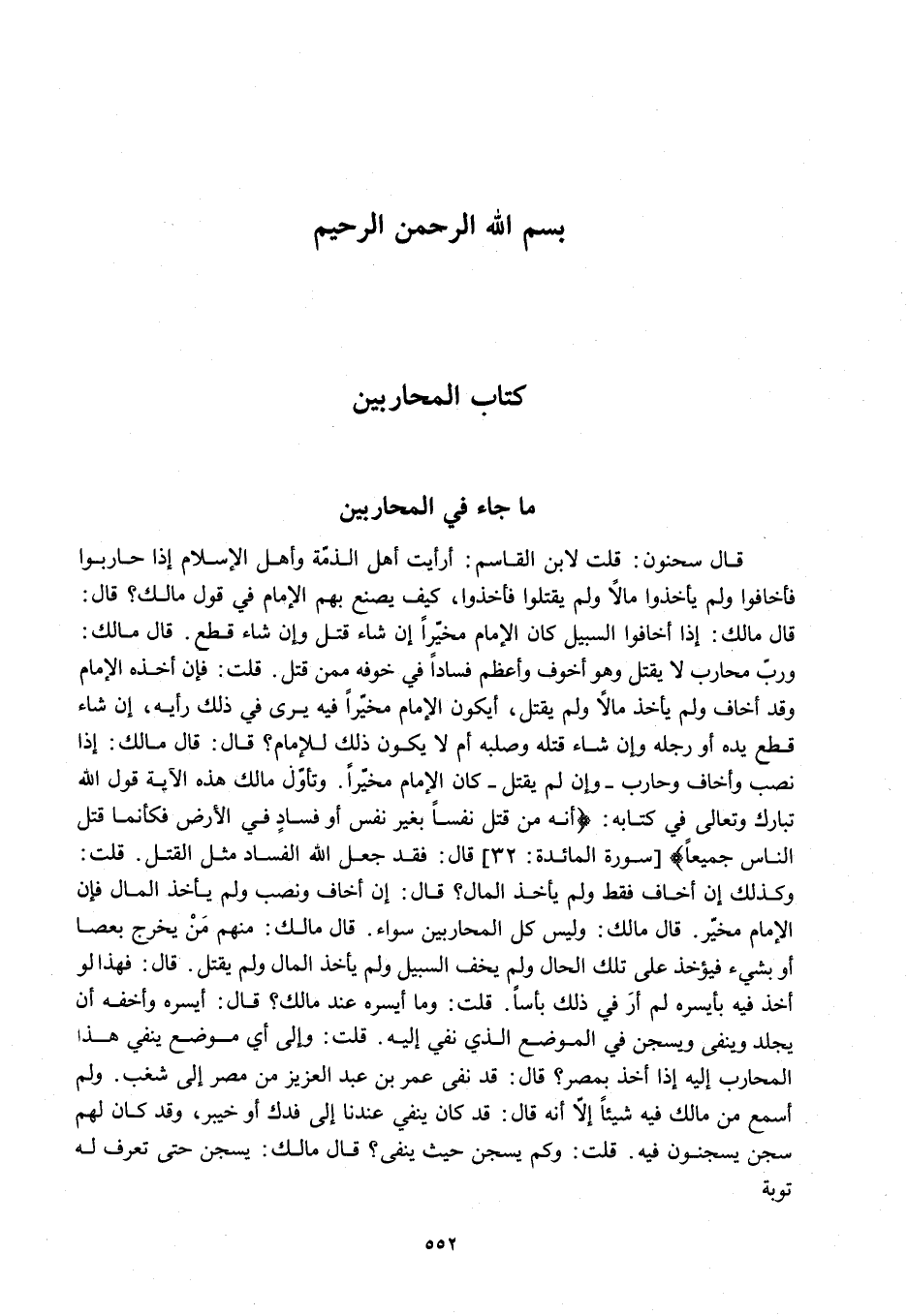 َ مَا جَاءَ فِي الْمُحَارِبِينَ قَالَ سَحْنُونٌ: قُلْتُ لِابْنِ الْقَاسِمِ: أَرَأَيْتَ أَهْلَ الذِّمَّةِ وَأَهْلَ الْإِسْلَامِ إذَا حَارَبُوا فَأَخَافُوا وَلَمْ يَأْخُذُوا مَالًا وَلَمْ يَقْتُلُوا فَأُخِذُوا، كَيْفَ يَصْنَعُ بِهِمْ الْإِمَامُ فِي قَوْلِ مَالِكٍ؟
