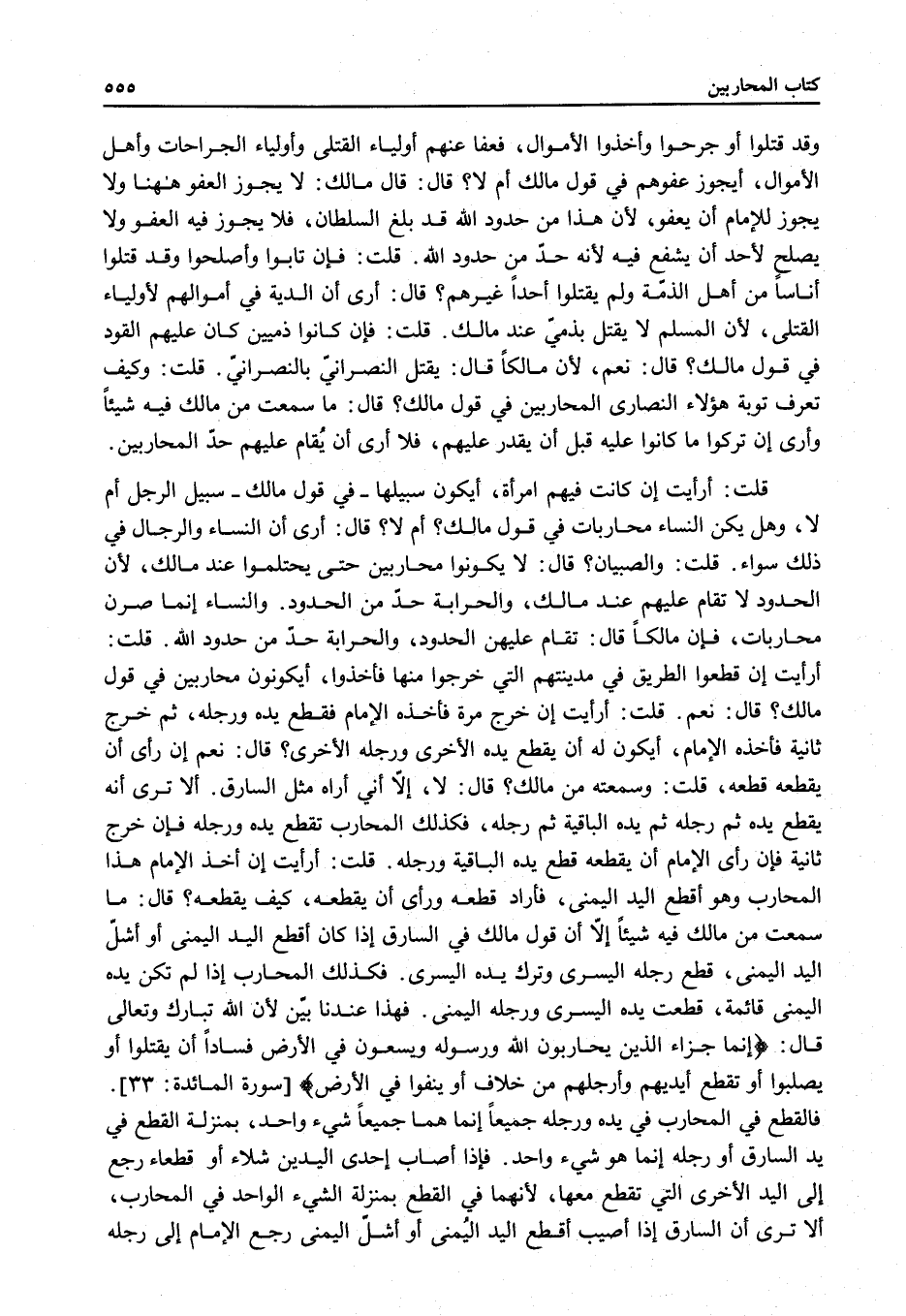 قُلْت: أَرَأَيْت إنْ كَانَتْ فِيهِمْ امْرَأَةٌ، أَيَكُونُ سَبِيلُهَا - فِي قَوْلِ مَالِكٍ - سَبِيلَ الرَّجُلِ أَمْ لَا، وَهَلْ يَكُنَّ النِّسَاءُ مُحَارِبَاتٍ فِي قَوْلِ مَالِكٍ؟ أَمْ لَا؟ قَالَ: أَرَى أَنَّ النِّسَاءَ وَالرِّجَالَ فِي ذَلِكَ سَوَاءٌ.