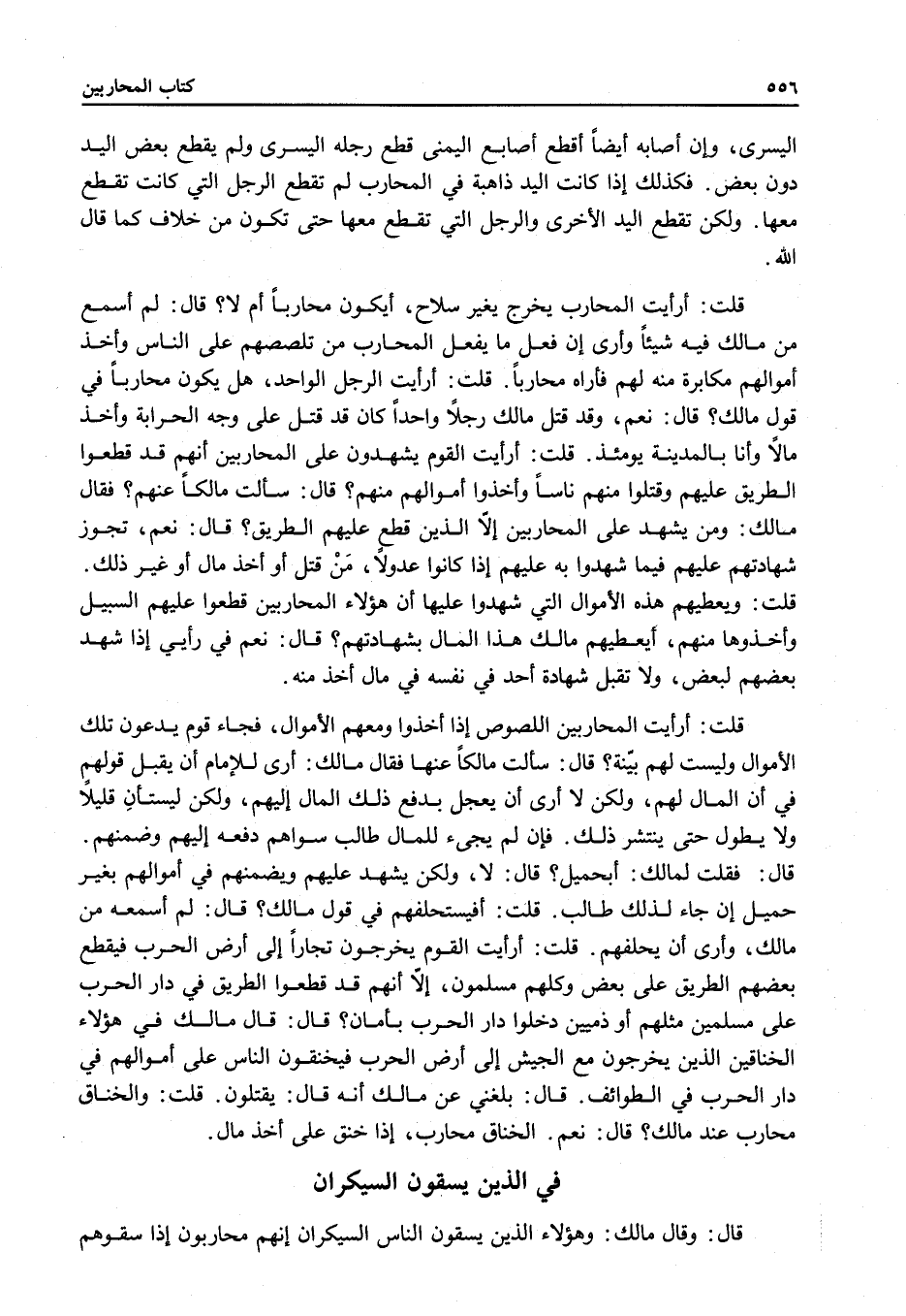 قُلْت: أَرَأَيْت الرَّجُلَ الْوَاحِدَ، هَلْ يَكُونُ مُحَارِبًا فِي قَوْلِ مَالِكٍ؟ قَالَ: نَعَمْ، وَقَدْ قَتَلَ مَالِكٌ رَجُلًا وَاحِدًا كَانَ قَدْ قَتَلَ عَلَى وَجْهِ الْحِرَابَةِ وَأَخَذَ مَالًا وَأَنَا بِالْمَدِينَةِ يَوْمَئِذٍ.