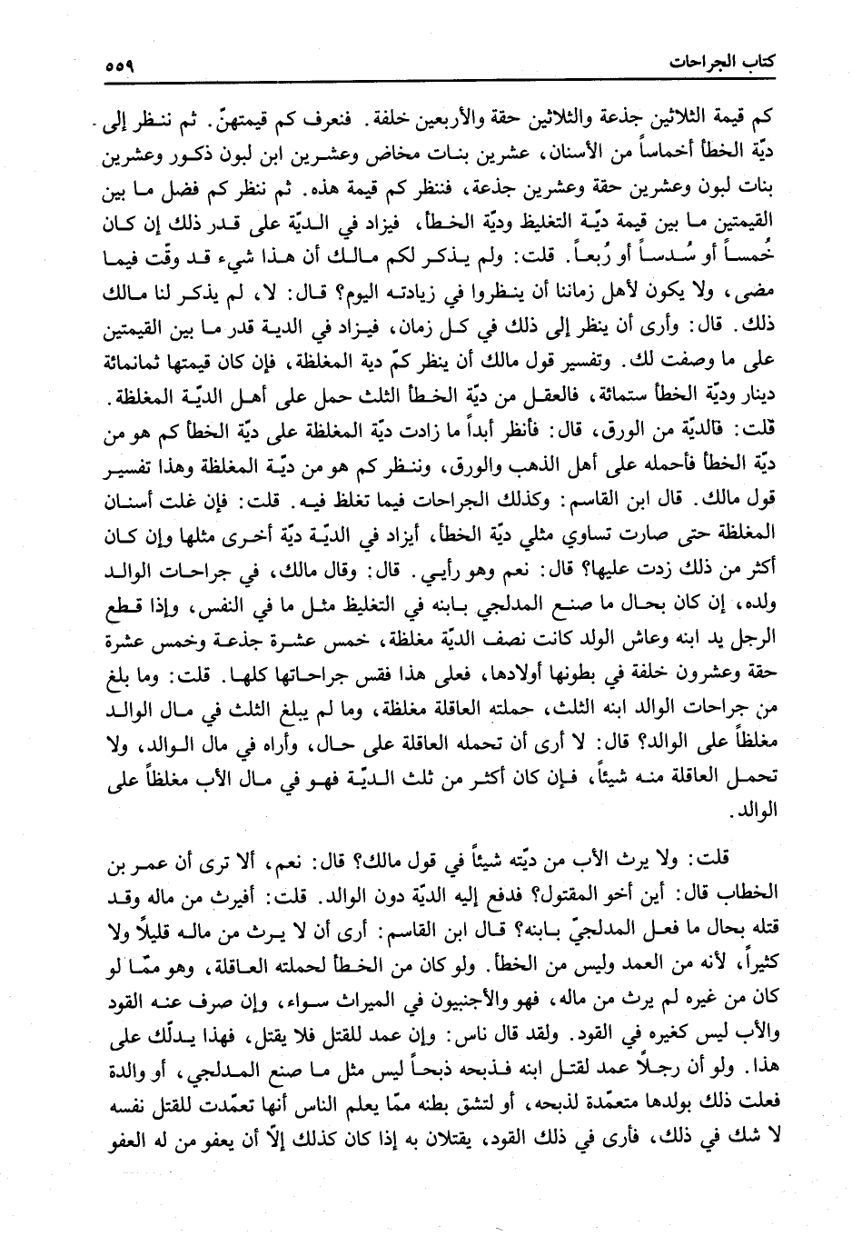 قُلْت: وَمَا بَلَغَ مِنْ جِرَاحَاتِ الْوَالِدِ ابْنَهُ الثُّلُثَ، حَمَلَتْهُ الْعَاقِلَةُ مُغَلَّظَةً، وَمَا لَمْ يَبْلُغْ الثُّلُثَ فِي مَالِ الْوَالِدِ مُغَلَّظًا عَلَى الْوَالِدِ؟ قَالَ: لَا أَرَى أَنْ تَحْمِلَهُ الْعَاقِلَةُ عَلَى حَالٍ، وَأَرَاهُ فِي مَالِ الْوَالِدِ، وَلَا تَحْمِلُ الْعَاقِلَةُ مِنْهُ شَيْئًا، فَإِنْ كَانَ أَكْثَرَ مِنْ ثُلُثِ الدِّيَةِ فَهُوَ فِي مَالِ الْأَبِ مُغَلَّظًا عَلَى الْوَالِدِ. قُلْت: وَلَا يَرِثُ الْأَبُ مِنْ دِيَتِهِ شَيْئًا فِي قَوْلِ مَالِكٍ؟