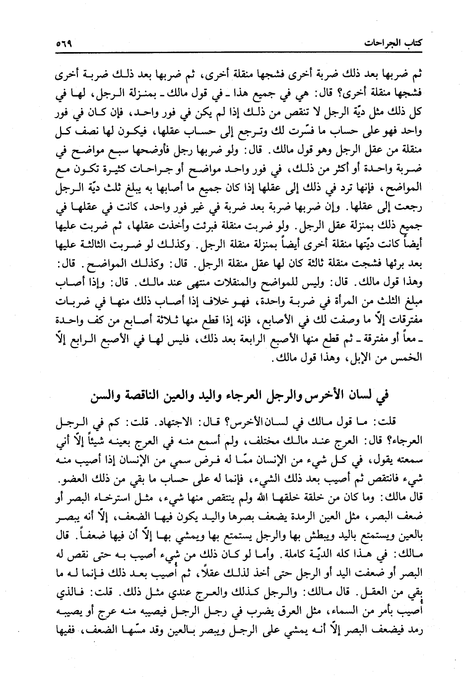 قَالَ: الْعَرَجُ عِنْدَ مَالِكٍ مُخْتَلِفٌ، وَلَمْ أَسْمَعْ مِنْهُ فِي الْعَرَجِ بِعَيْنِهِ شَيْئًا إلَّا أَنِّي سَمِعْتُهُ يَقُولُ: فِي كُلِّ شَيْءٍ مِنْ الْإِنْسَانِ مِمَّا لَهُ فَرْضٌ سُمِّيَ مِنْ الْإِنْسَانِ إذَا أُصِيبَ مِنْهُ شَيْءٌ فَانْتَقَصَ ثُمَّ أُصِيبَ - بَعْدَ ذَلِكَ - الشَّيْءُ، فَإِنَّمَا لَهُ عَلَى حِسَابِ مَا بَقِيَ مِنْ ذَلِكَ الْعُضْوِ.