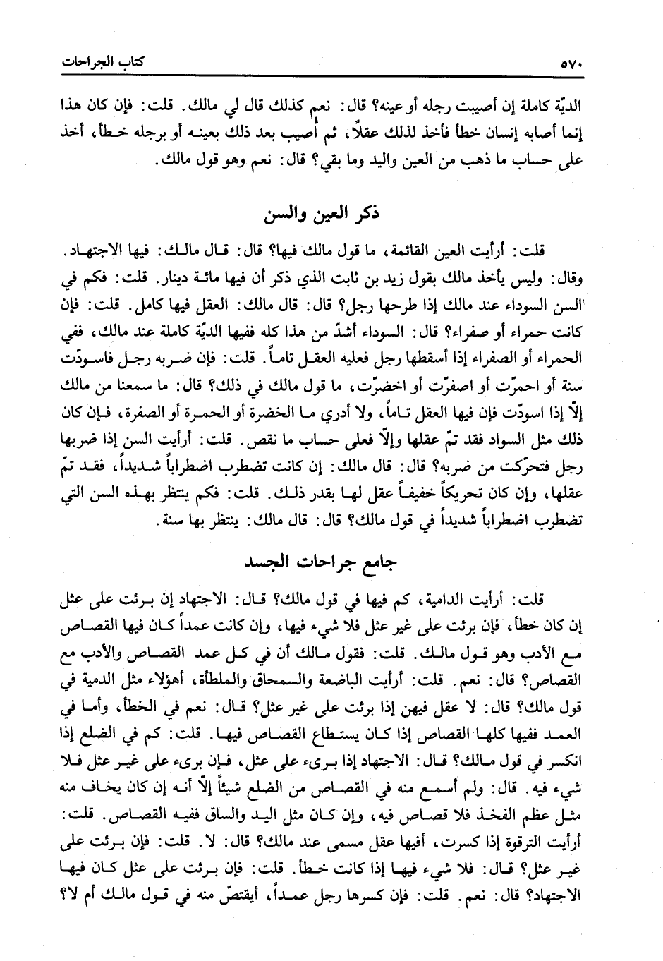 ذِكْرُ الْعَيْنِ وَالسِّنِّ قُلْتُ: أَرَأَيْتَ الْعَيْنَ الْقَائِمَةَ، مَا قَوْلُ مَالِكٍ فِيهَا؟