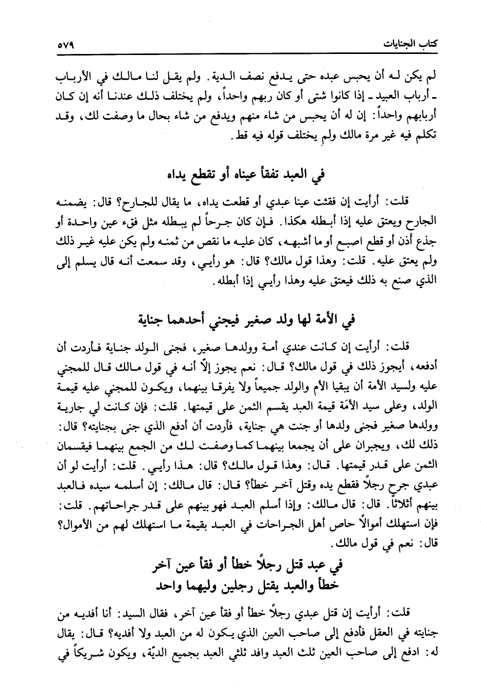 فِي الْعَبْدِ تُفْقَأُ عَيْنَاهُ أَوْ تُقْطَعُ يَدَاهُ قُلْتُ: أَرَأَيْتَ إنْ فُقِئَتْ عَيْنَا عَبْدِي أَوْ قُطِعَتْ يَدَاهُ، مَا يُقَالُ لِلْجَارِحِ؟
