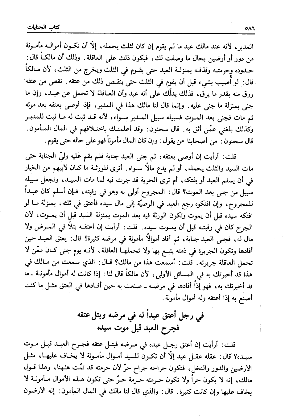 قُلْتُ: أَرَأَيْتَ إنْ أَعْتَقَهُ بَتْلًا فِي الْمَرَضِ وَلَا مَالَ لَهُ، فَجَنَى الْعَبْدُ جِنَايَةً، ثُمَّ أَفَادَ أَمْوَالًا مَأْمُونَةً فِي مَرَضِهِ كَثِيرَةً؟ قَالَ: يُعْتَقُ الْعَبْدُ حِينَ أَفَادَهَا وَتَكُونُ الْجَرِيرَةُ فِي ذِمَّتِهِ يُتْبَعُ بِهَا وَلَا تَحْمِلُهَا الْعَاقِلَةُ، لِأَنَّهُ يَوْمَ جَنَى كَانَ مِمَّنْ لَا تَحْمِلُ الْعَاقِلَةُ جَرِيرَتَهُ.