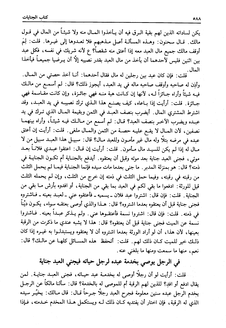 فِي الرَّجُلِ يُوصِي بِخِدْمَةِ عَبْدِهِ لِرَجُلٍ حَيَاتَهُ فَيَجْنِي الْعَبْدُ جِنَايَةً قُلْتُ: أَرَأَيْتَ لَوْ أَنَّ رَجُلًا أَوْصَى لَهُ بِخِدْمَةِ عَبْدٍ حَيَاتَهُ، فَجَنَى الْعَبْدُ جِنَايَةً. لِمَنْ يُقَالُ: ادْفَعْ أَوْ افْدِ؟ لِلَّذِينَ لَهُمْ الرَّقَبَةُ أَمْ لِلْمُوصَى لَهُ بِالْخِدْمَةِ؟ قَالَ: سَأَلْنَا مَالِكًا عَنْ الرَّجُلِ يَخْدُمُ الرَّجُلَ عَبْدَهُ سِنِينَ مَعْلُومَةً فَجَرَحَ الْعَبْدُ رَجُلًا جُرْحًا قَالَ: قَالَ مَالِكٌ يُخَيَّرُ سَيِّدُهُ الَّذِي لَهُ الرَّقَبَةُ، فَإِنْ اخْتَارَ أَنْ يَفْتَدِيَهُ كَانَ ذَلِكَ لَهُ، وَيَسْتَكْمِلُ هَذَا الْمُخْدَمِ خِدْمَتَهُ، فَإِذَا