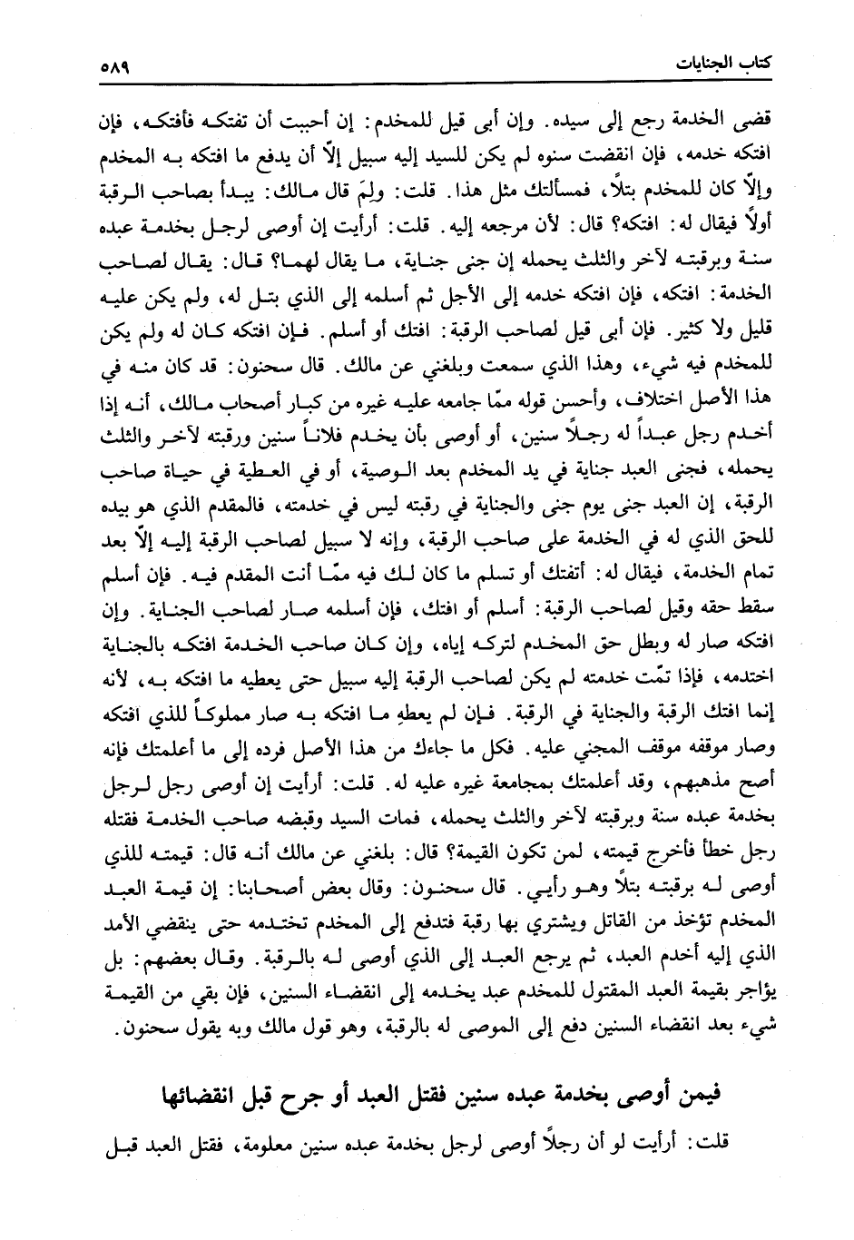 قَالَ سَحْنُونٌ: قَدْ كَانَ مِنْهُ فِي هَذَا الْأَصْلِ اخْتِلَافٌ، وَأَحْسَنُ قَوْلِهِ مِمَّا جَامَعَهُ عَلَيْهِ غَيْرُهُ مِنْ كِبَارِ أَصْحَابِ مَالِكٍ: أَنَّهُ إذَا أَخْدَمَ رَجُلٌ عَبْدًا لَهُ رَجُلًا سِنِينَ، أَوْ أَوْصَى بِأَنْ يَخْدُمَ فُلَانًا سِنِينَ وَرَقَبَتُهُ لِآخَرَ، وَالثُّلُثُ يَحْمِلُهُ، فَجَنَى الْعَبْدُ جِنَايَةً فِي يَدِ الْمُخْدِمِ بَعْدَ الْوَصِيَّةِ، أَوْ فِي الْعَطِيَّةِ فِي صَاحِبِ الرَّقَبَةِ، إنَّ الْعَبْدَ جَنَى يَوْمَ جَنَى، وَالْجِنَايَةُ فِي رَقَبَتِهِ لَيْسَ فِي خِدْمَتِهِ، فَالْمُقَدَّمُ الَّذِي هُوَ بِيَدِهِ لِلْحَقِّ الَّذِي لَهُ فِي الْخِدْمَةِ عَلَى صَاحِبِ الرَّقَبَةِ، وَإِنَّهُ لَا سَبِيلَ لِصَاحِبِ الرَّقَبَةِ إلَيْهِ إلَّا بَعْدَ تَمَامِ الْخِدْمَةِ، فَيُقَالُ لَهُ: أَتَفْتَكُّ أَوْ تُسْلِمُ مَا كَانَ لَكَ فِيهِ مِمَّا أَنْتَ الْمُقَدَّمُ فِيهِ. فَإِنْ أَسْلَمَ سَقَطَ حَقُّهُ وَقِيلَ لِصَاحِبِ الرَّقَبَةِ: أَسْلِمْ أَوْ افْتَكَّ، فَإِنْ أَسْلَمَهُ صَارَ لِصَاحِبِ الْجِنَايَةِ. وَإِنْ افْتَكَّهُ صَارَ لَهُ وَبَطَلَ حَقُّ الْمُخْدَمِ لِتَرْكِهِ إيَّاهُ، وَإِنْ كَانَ صَاحِبُ الْخِدْمَةِ افْتَكَّهُ بِالْجِنَايَةِ اخْتَدَمَهُ، فَإِذَا تَمَّتْ خِدْمَتُهُ لَمْ يَكُنْ لِصَاحِبِ الرَّقَبَةِ إلَيْهِ سَبِيلٌ حَتَّى يُعْطِيَهُ مَا افْتَكَّهُ بِهِ، لِأَنَّهُ إنَّمَا افْتَكَّ الرَّقَبَةَ، وَالْجِنَايَةُ فِي الرَّقَبَةِ. فَإِنْ لَمْ يُعْطِهِ مَا افْتَكَّهُ بِهِ صَارَ مَمْلُوكًا لِلَّذِي افْتَكَّهُ وَصَارَ مَوْقِفُهُ مَوْقِفَ الْمَجْنِيّ عَلَيْهِ. فَكُلُّ مَا جَاءَكَ مِنْ هَذَا الْأَصْلِ فَرُدَّهُ إلَى مَا أَعْلَمْتُكَ فَإِنَّهُ أَصَحُّ مَذْهَبِهِمْ، وَقَدْ أَعْلَمْتُكَ بِمُجَامَعَةِ غَيْرِهِ عَلَيْهِ لَهُ.