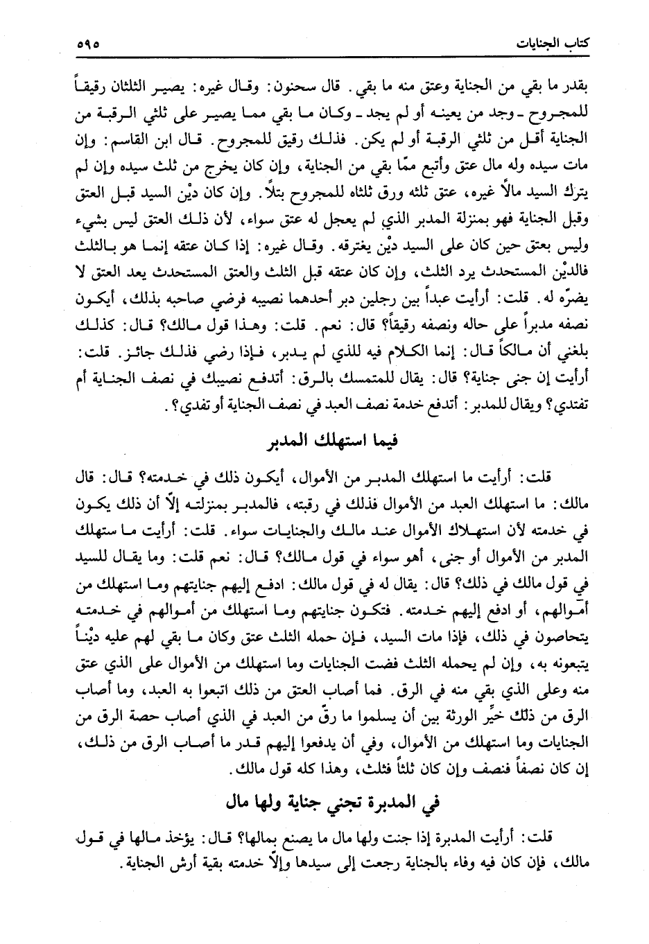 قَالَ: قَالَ مَالِكٌ: مَا اسْتَهْلَكَ الْعَبْدُ مِنْ الْأَمْوَالِ فَذَلِكَ فِي رَقَبَتِهِ، فَالْمُدَبَّرُ بِمَنْزِلَتِهِ إلَّا أَنَّ ذَلِكَ يَكُونُ فِي خِدْمَتِهِ لِأَنَّ اسْتِهْلَاكَ الْأَمْوَالِ - عِنْدَ مَالِكٍ - وَالْجِنَايَاتِ سَوَاءٌ.