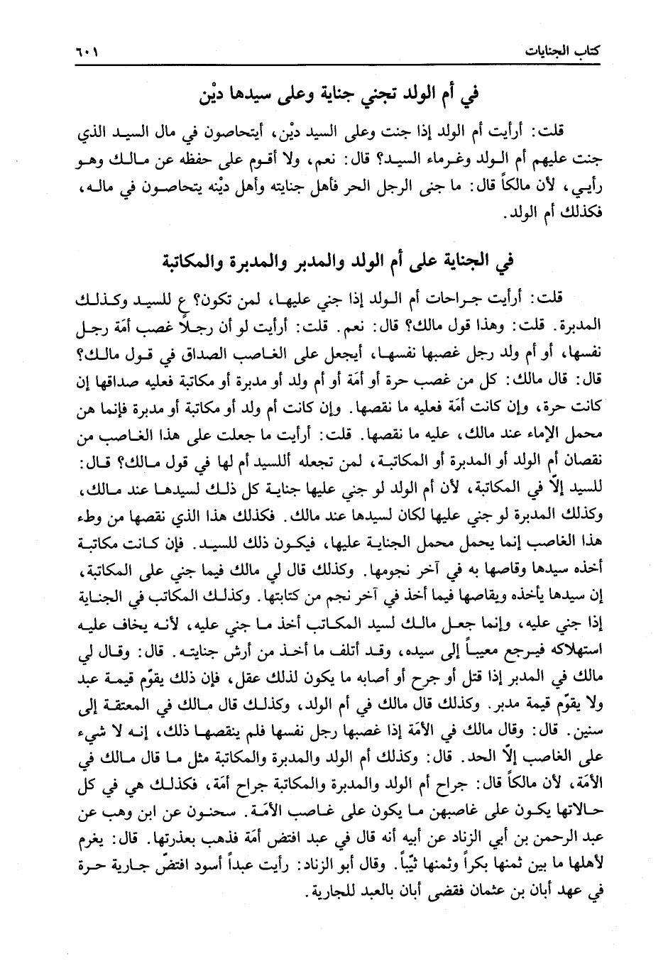 قَالَ: وَقَالَ مَالِكٌ فِي الْأَمَةِ إذَا غَصَبَهَا رَجُلٌ نَفْسَهَا فَلَمْ يَنْقُصْهَا ذَلِكَ: إنَّهُ لَا شَيْءَ عَلَى الْغَاصِبِ إلَّا الْحَدُّ. قَالَ: وَكَذَلِكَ أُمُّ الْوَلَدِ وَالْمُدَبَّرَةُ وَالْمُكَاتَبَةُ مِثْلُ مَا قَالَ مَالِكٌ فِي الْأَمَةِ، لِأَنَّ مَالِكًا قَالَ: جِرَاحُ أُمِّ الْوَلَدِ وَالْمُدَبَّرَةِ وَالْمُكَاتَبَةِ جِرَاحَ أَمَةٍ، فَكَذَلِكَ هِيَ فِي كُلِّ حَالَاتِهَا يَكُونُ عَلَى غَاصِبِهِنَّ مَا يَكُونُ عَلَى غَاصِبِ الْأَمَةِ سَحْنُونٌ عَنْ ابْنِ وَهْبٍ عَنْ عَبْدِ الرَّحْمَنِ بْنِ أَبِي الزِّنَادِ عَنْ أَبِيهِ أَنَّهُ قَالَ فِي عَبْدٍ افْتَضَّ أَمَةً فَذَهَبَ بِعُذْرَتِهَا. قَالَ يَغْرَمُ لِأَهْلِهَا مَا بَيْنَ ثَمَنِهَا بِكْرًا وَثَمَنِهَا ثَيِّبًا.