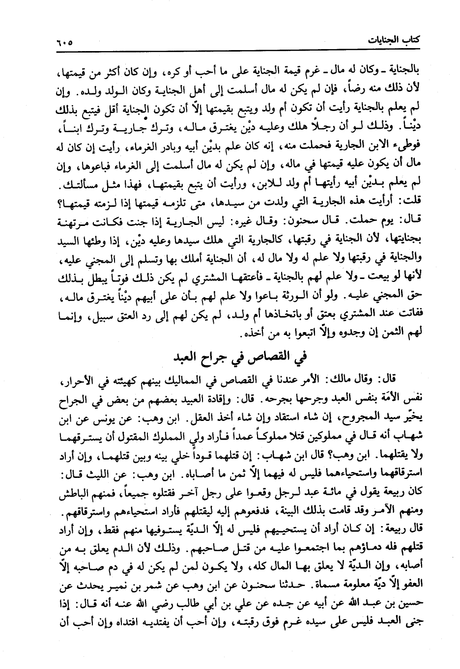 فِي الْقِصَاصِ فِي جِرَاحِ الْعَبْدِ قَالَ: وَقَالَ مَالِكٌ: الْأَمْرُ عِنْدَنَا فِي الْقِصَاصِ فِي الْمَمَالِيكِ بَيْنَهُمْ كَهَيْئَتِهِ فِي الْأَحْرَارِ، نَفْسُ الْأَمَةِ بِنَفْسِ الْعَبْدِ وَجُرْحُهَا بِجُرْحِهِ. قَالَ: وَإِقَادَةُ الْعَبِيدِ بَعْضُهُمْ مِنْ بَعْضٍ فِي الْجِرَاحِ يُخَيَّرُ سَيِّدُ الْمَجْرُوحِ، إنْ شَاءَ اسْتَقَادَ وَإِنْ شَاءَ أَخَذَ الْعَقْلَ ابْنُ وَهْبٍ: عَنْ يُونُسَ عَنْ ابْنِ شِهَابٍ أَنَّهُ قَالَ فِي مَمْلُوكَيْنِ قَتَلَا مَمْلُوكًا عَمْدًا فَأَرَادَ وَلِيُّ الْمَمْلُوكِ الْمَقْتُولِ أَنْ يَسْتَرِقَّهُمَا وَلَا يَقْتُلَهُمَا ابْنُ وَهْبٍ؟ قَالَ ابْنُ شِهَابٍ: إنْ قَتَلَهُمَا قَوَدًا خُلِّيَ بَيْنَهُ وَبَيْنَ قَتْلِهِمَا، وَإِنْ أَرَادَ اسْتِرْقَاقَهُمَا وَاسْتِحْيَاءَهُمَا فَلَيْسَ لَهُ فِيهِمَا إلَّا ثَمَنُ مَا أَصَابَاهُ. ابْنُ وَهْبٍ: عَنْ اللَّيْثِ قَالَ: كَانَ رَبِيعَةُ يَقُولُ فِي مِائَةِ عَبْدٍ لِرَجُلٍ وَقَعُوا عَلَى رَجُلٍ آخَرَ فَقَتَلُوهُ جَمِيعًا، فَمِنْهُمْ الْبَاطِشُ وَمِنْهُمْ الْآمِرُ، وَقَدْ قَامَتْ بِذَلِكَ الْبَيِّنَةُ، فَدَفَعُوهُمْ إلَيْهِ لِيَقْتُلَهُمْ فَأَرَادَ اسْتِحْيَاءَهُمْ وَاسْتِرْقَاقَهُمْ قَالَ رَبِيعَةُ: إنْ كَانَ أَرَادَ أَنْ يَسْتَحْيِيَهُمْ فَلَيْسَ لَهُ إلَّا الدِّيَةُ يَسْتَوْفِيهَا مِنْهُمْ فَقَطْ، وَإِنْ أَرَادَ قَتَلَهُمْ فَلَهُ دِمَاؤُهُمْ بِمَا اجْتَمَعُوا عَلَيْهِ مِنْ قَتْلِ صَاحِبِهِمْ. وَذَلِكَ لِأَنَّ الدَّمَ يُعَلَّقُ بِهِ مَنْ أَصَابَهُ، وَأَنَّ الدِّيَةَ لَا يُعَلَّقُ بِهَا الْمَالُ كُلُّهُ، وَلَا يَكُونُ لِمَنْ لَمْ يَكُنْ لَهُ فِي دَمِ صَاحِبِهِ إلَّا الْعَفْوُ إلَّا دِيَةٌ مَعْلُومَةٌ مُسَمَّاةٌ.