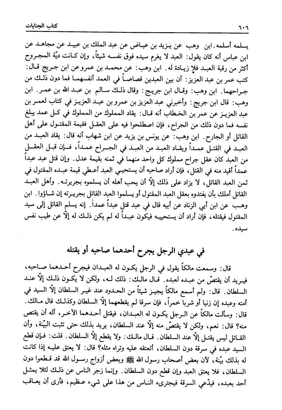 يُسْلِمَهُ أَسْلَمَهُ ابْنُ وَهْبٍ عَنْ يَزِيدَ بْنِ عِيَاضٍ عَنْ عَبْدِ الْمَلِكِ بْنِ عُبَيْدٍ عَنْ مُجَاهِدٍ عَنْ ابْنِ عَبَّاسٍ أَنَّهُ كَانَ يَقُولُ: الْعَبْدُ لَا يَغْرَمُ سَيِّدُهُ فَوْقَ نَفْسِهِ شَيْئًا، وَإِنْ كَانَتْ دِيَةُ الْمَجْرُوحِ أَكْثَرَ مِنْ رَقَبَةِ الْعَبْدِ فَلَا زِيَادَةَ لَهُ ابْنُ وَهْبٍ: عَنْ مُحَمَّدِ بْنِ عَمْرٍو عَنْ ابْنِ جُرَيْجٍ قَالَ: كَتَبَ عُمَرُ بْنُ عَبْدِ الْعَزِيزِ: أَنَّ بَيْنَ الْعَبْدَيْنِ قِصَاصًا فِي الْعَمْدِ أَنْفُسِهِمَا فَمَا دُونَ ذَلِكَ مِنْ جِرَاحِهِمَا ابْنُ وَهْبٍ: وَقَالَ ابْنُ جُرَيْجٍ: وَقَالَ ذَلِكَ سَالِمُ بْنُ عَبْدِ اللَّهِ بْنِ عُمَرَ ابْنُ وَهْبٍ: قَالَ ابْنُ جُرَيْجٍ: وَأَخْبَرَنِي عَبْدُ الْعَزِيزِ بْنُ عَمْرِو بْنِ عَبْدِ الْعَزِيزِ فِي كِتَابٍ لِعُمَرَ بْنِ عَبْدِ الْعَزِيزِ عَنْ عُمَرَ بْنِ الْخَطَّابِ أَنَّهُ قَالَ: يُقَادُ الْمَمْلُوكُ مِنْ الْمَمْلُوكِ فِي كُلِّ عَمْدٍ يَبْلُغُ نَفْسَهُ فَمَا دُونَ ذَلِكَ مِنْ الْجِرَاحِ، فَإِنْ اصْطَلَحُوا فِيهِ عَلَى الْعَقْلِ فَقِيمَةُ الْمَقْتُولِ عَلَى أَهْلِ الْقَاتِلِ أَوْ الْجَارِحِ ابْنُ وَهْبٍ: عَنْ يُونُسَ بْنِ يَزِيدَ عَنْ ابْنِ شِهَابٍ أَنَّهُ قَالَ: يُقَادُ الْعَبْدُ مِنْ الْعَبْدِ فِي الْقَتْلِ عَمْدًا وَيُقَادُ الْعَبْدُ مِنْ الْعَبْدِ فِي الْجِرَاحِ عَمْدًا، فَإِنْ قَبِلَ الْعَقْلُ مِنْ الْعَبْدِ كَانَ عَقْلُ جِرَاحِ مَمْلُوكِ كُلِّ وَاحِدٍ مِنْهُمَا فِي ثَمَنِهِ بِقِيمَةِ عَدْلٍ. وَإِنْ قَتَلَ عَبْدٌ عَبْدًا عَمْدًا أُقِيدَ مِنْهُ فِي الْقَتْلِ، فَإِنْ أَرَادَ صَاحِبُهُ أَنْ يَسْتَحْيِيَ الْعَبْدَ أَعْطَى قِيمَةَ عَبْدِهِ الْمَقْتُولِ فِي ثَمَنِ الْعَبْدِ الْقَاتِلِ، لَا يُزَادُ عَلَى ذَلِكَ إلَّا أَنْ يُحِبَّ أَهْلُهُ أَنْ يُسْلِمُوهُ بِجَرِيرَتِهِ وَأَهْلُ الْعَبْدِ الْقَاتِلِ أَمْلَكُ بِأَنْ يَفْتَدُوهُ بِعَقْلِ الْعَبْدِ الْمَقْتُولِ أَوْ يُسْلِمُوا الْعَبْدَ الْقَاتِلَ بِجَرِيرَتِهِ إنْ شَاءُوا ابْنُ وَهْبٍ عَنْ ابْنِ أَبِي الزِّنَادِ عَنْ أَبِيهِ قَالَ فِي عَبْدٍ قَتَلَ عَبْدًا عَمْدًا: إنَّهُ يُسْلِمُ الْقَاتِلَ إلَى سَيِّدِ الْمَقْتُولِ فَيَقْتُلُهُ، فَإِنْ أَرَادَ أَنْ يَسْتَحْيِيَهُ فَيَكُونَ عَبْدًا لَهُ لَمْ يَكُنْ ذَلِكَ لَهُ إلَّا عَنْ طِيبِ نَفْسِ سَيِّدِهِ.