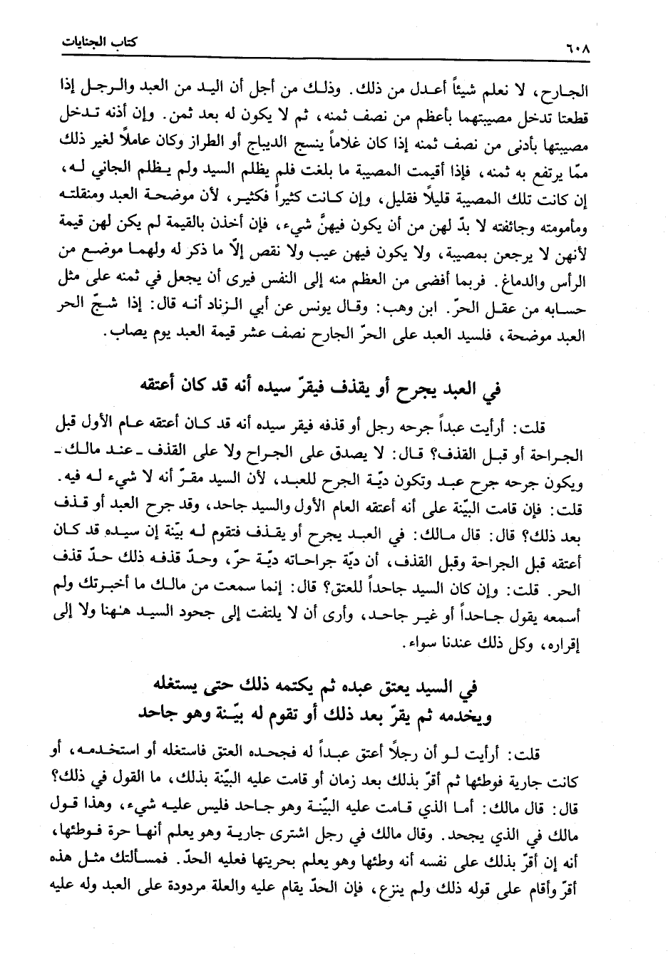 فِي الْعَبْدِ يُجْرَحُ أَوْ يُقْذَفُ فَيُقِرُّ سَيِّدُهُ أَنَّهُ قَدْ كَانَ أَعْتَقَهُ قُلْتُ: أَرَأَيْتَ عَبْدًا جَرَحَهُ رَجُلٌ أَوْ قَذَفَهُ فَيُقِرُّ سَيِّدُهُ أَنَّهُ قَدْ كَانَ أَعْتَقَهُ عَامَ الْأَوَّلِ قَبْلَ الْجِرَاحَةِ أَوْ قَبْلَ الْقَذْفِ؟