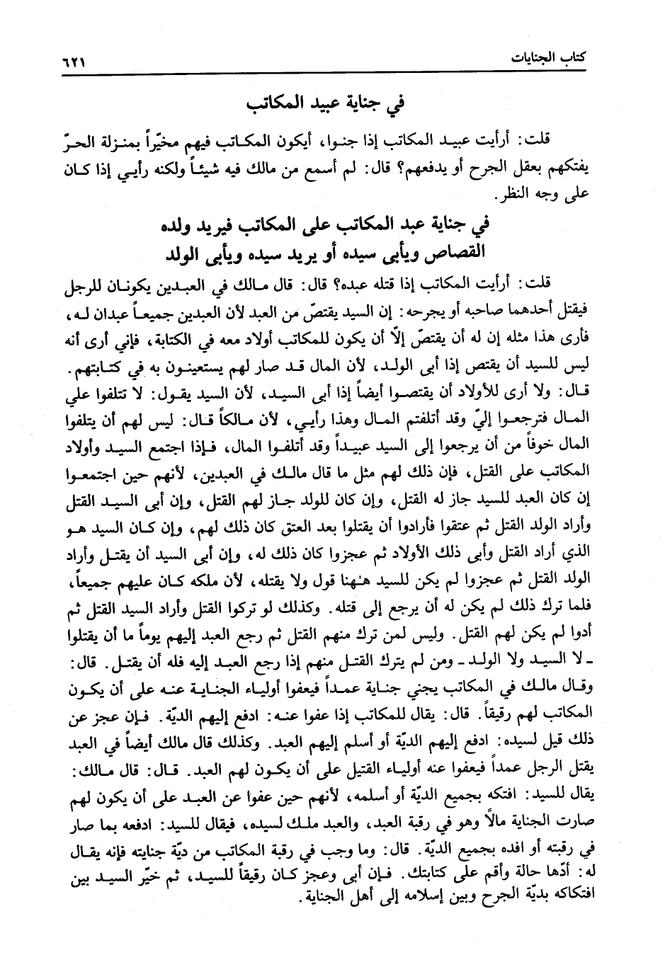 قُلْتُ: أَرَأَيْتَ الْمُكَاتَبَ إذَا قَتَلَهُ عَبْدُهُ؟ قَالَ: قَالَ مَالِكٌ فِي الْعَبْدَيْنِ يَكُونَانِ لِلرَّجُلِ فَيَقْتُلُ أَحَدُهُمَا صَاحِبَهُ أَوْ يَجْرَحُهُ: إنَّ السَّيِّدَ يَقْتَصُّ مِنْ الْعَبْدِ لِأَنَّ الْعَبْدَيْنِ جَمِيعًا عَبْدَانِ لَهُ، فَأَرَى هَذَا مِثْلَهُ أَنَّ لَهُ أَنْ يَقْتَصَّ إلَّا أَنْ يَكُونَ لِلْمُكَاتَبِ أَوْلَادٌ مَعَهُ فِي الْكِتَابَةِ، فَإِنِّي أَرَى أَنَّهُ لَيْسَ لِلسَّيِّدِ أَنْ يَقْتَصَّ إذَا أَبَى الْوَلَدُ؛ لِأَنَّ الْمَالَ قَدْ صَارَ لَهُمْ يَسْتَعِينُونَ بِهِ فِي كِتَابَتِهِمْ. قَالَ: وَلَا أَرَى لِلْأَوْلَادِ أَنْ يَقْتَصُّوا أَيْضًا إذَا أَبَى السَّيِّدُ؛ لِأَنَّ السَّيِّدَ يَقُولُ: لَا تُتْلِفُوا عَلَيَّ الْمَالَ فَتَرْجِعُوا إلَيَّ وَقَدْ أَتْلَفْتُمْ الْمَالَ وَهَذَا رَأْيِي؛ لِأَنَّ مَالِكًا قَالَ: لَيْسَ لَهُمْ أَنْ يُتْلِفُوا الْمَالَ خَوْفًا مِنْ أَنْ يَرْجِعُوا إلَى السَّيِّدِ عَبِيدًا وَقَدْ أَتْلَفُوا الْمَالَ، فَإِذَا اجْتَمَعَ السَّيِّدُ وَأَوْلَادُ الْمُكَاتَبِ عَلَى الْقَتْلِ، فَإِنَّ ذَلِكَ لَهُمْ مِثْلُ مَا قَالَ مَالِكٌ فِي الْعَبْدَيْنِ؛ لِأَنَّهُمْ حِينَ اجْتَمَعُوا إنْ كَانَ الْعَبْدُ لِلسَّيِّدِ جَازَ لَهُ الْقَتْلُ، وَإِنْ كَانَ لِلْوَلَدِ جَازَ لَهُمْ الْقَتْلُ، وَإِنْ أَبَى السَّيِّدُ الْقَتْلَ وَأَرَادَ الْوَلَدُ الْقَتْلَ ثُمَّ عَتَقُوا فَأَرَادُوا أَنْ يَقْتُلُوا بَعْدَ الْعِتْقِ كَانَ ذَلِكَ لَهُمْ، وَإِنْ كَانَ السَّيِّدُ هُوَ الَّذِي أَرَادَ الْقَتْلَ وَأَبَى ذَلِكَ الْأَوْلَادُ ثُمَّ عَجَزُوا كَانَ ذَلِكَ لَهُ، وَإِنْ أَبَى السَّيِّدُ أَنْ يَقْتُلَ وَأَرَادَ الْوَلَدُ الْقَتْلَ ثُمَّ عَجَزُوا لَمْ يَكُنْ لِلسَّيِّدِ هَاهُنَا قَوْلٌ وَلَا يَقْتُلُهُ؛ لِأَنَّ مِلْكَهُ كَانَ عَلَيْهِمْ جَمِيعًا، فَلَمَّا تَرَكَ ذَلِكَ لَمْ يَكُنْ لَهُ أَنْ يَرْجِعَ إلَى قَتْلِهِ. وَكَذَلِكَ لَوْ تَرَكُوا الْقَتْلَ وَأَرَادَ السَّيِّدُ الْقَتْلَ ثُمَّ أَدَّوْا لَمْ يَكُنْ لَهُمْ الْقَتْلُ. وَلَيْسَ لِمَنْ تَرَكَ مِنْهُمْ الْقَتْلَ ثُمَّ رَجَعَ الْعَبْدُ إلَيْهِمْ يَوْمًا مَا أَنْ يَقْتُلُوا - لَا السَّيِّدُ وَلَا الْوَلَدُ - وَمَنْ لَمْ يَتْرُكْ الْقَتْلَ مِنْهُمْ إذَا رَجَعَ الْعَبْدُ إلَيْهِ فَلَهُ أَنْ يَقْتُلَ.