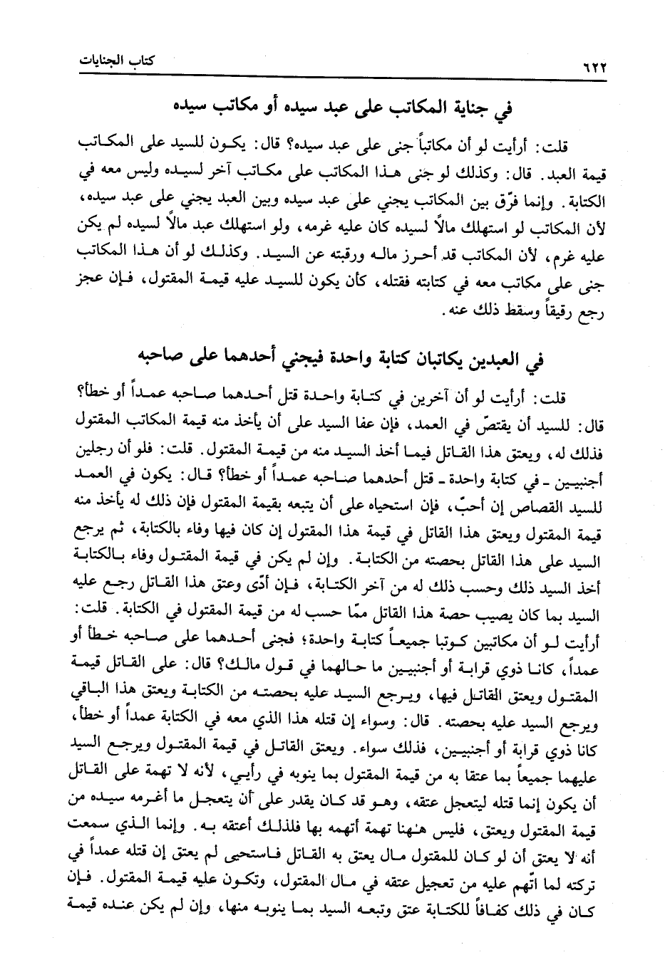 قُلْتُ: أَرَأَيْتَ لَوْ أَنَّ آخَرَيْنِ فِي كِتَابَةٍ وَاحِدَةٍ قَتَلَ أَحَدُهُمَا صَاحِبَهُ عَمْدًا أَوْ خَطَأً؟ قَالَ: لِلسَّيِّدِ أَنْ يَقْتَصَّ فِي الْعَمْدِ، فَإِنْ عَفَا السَّيِّدُ عَلَى أَنْ يَأْخُذَ مِنْهُ قِيمَةَ الْمُكَاتَبِ الْمَقْتُولِ فَذَلِكَ لَهُ، وَيَعْتِقُ هَذَا الْقَاتِلُ فِيمَا أَخَذَ السَّيِّدُ مِنْهُ مِنْ قِيمَةِ الْمَقْتُولِ.