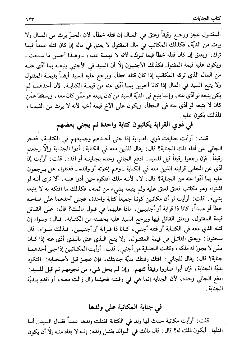 فِي ذَوِي الْقَرَابَةِ يُكَاتَبُونَ كِتَابَةً وَاحِدَةً ثُمَّ يَجْنِي بَعْضُهُمْ قُلْتُ: أَرَأَيْتَ جِنَايَاتِ ذَوِي الْقَرَابَةِ إذَا جَنَى أَحَدُهُمْ وَجَمِيعُهُمْ فِي الْكِتَابَةِ، فَعَجَزَ الْجَانِي عَنْ أَدَاءِ تِلْكَ الْجِنَايَةِ؟ قَالَ: يُقَالُ لِلَّذِينَ مَعَهُ فِي الْكِتَابَةِ: أَدُّوا الْجِنَايَةَ وَإِلَّا رَجَعْتُمْ رَقِيقًا. فَإِنْ رَجَعُوا رَقِيقًا قِيلَ لِلسَّيِّدِ: ادْفَعْ الْجَانِيَ وَحْدَهُ بِجِنَايَتِهِ أَوْ افْدِهِ.