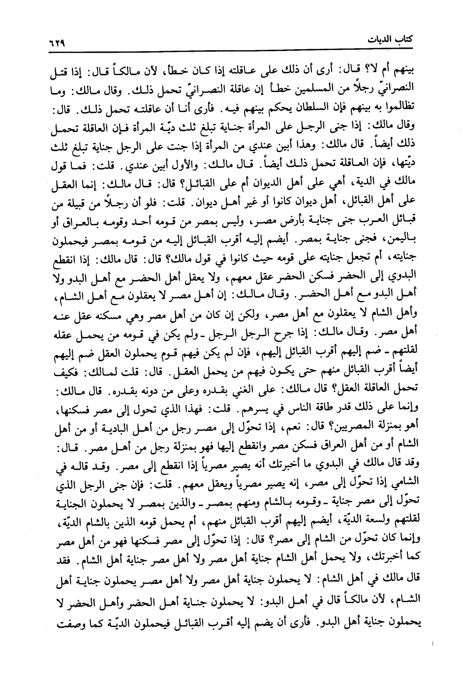 قُلْتُ فَمَا قَوْلُ مَالِكٍ فِي الدِّيَةِ، أَهِيَ عَلَى أَهْلِ الدِّيوَانِ أَمْ عَلَى الْقَبَائِلِ؟ قَالَ: قَالَ مَالِكٌ: إنَّمَا الْعَقْلُ عَلَى أَهْلِ الْقَبَائِلِ، أَهْلَ دِيوَانٍ كَانُوا أَوْ غَيْرَ أَهْلِ دِيوَانٍ
