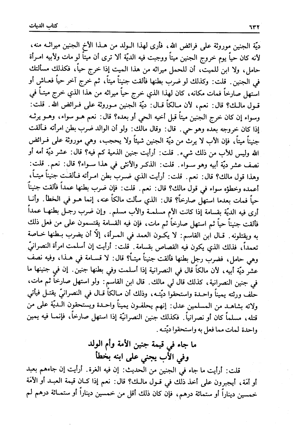 قُلْتُ: أَرَأَيْتَ مَا جَاءَ فِي الْجَنِينِ مِنْ الْحَدِيثِ: إنَّ فِيهِ الْغُرَّةَ. أَرَأَيْت إنْ جَاءَهُمْ بِعَبْدٍ أَوْ أَمَةٍ، أَيُجْبَرُونَ عَلَى أَخْذِ ذَلِكَ فِي قَوْلِ مَالِكٍ؟ قَالَ: نَعَمْ إذَا كَانَ قِيمَةُ الْعَبْدِ أَوْ الْأَمَةِ خَمْسِينَ دِينَارًا أَوْ سِتَّمِائَةِ دِرْهَمٍ، فَإِنْ كَانَ ذَلِكَ أَقَلَّ مِنْ خَمْسِينَ دِينَارًا أَوْ سِتَّمِائَةِ دِرْهَمٍ لَمْ