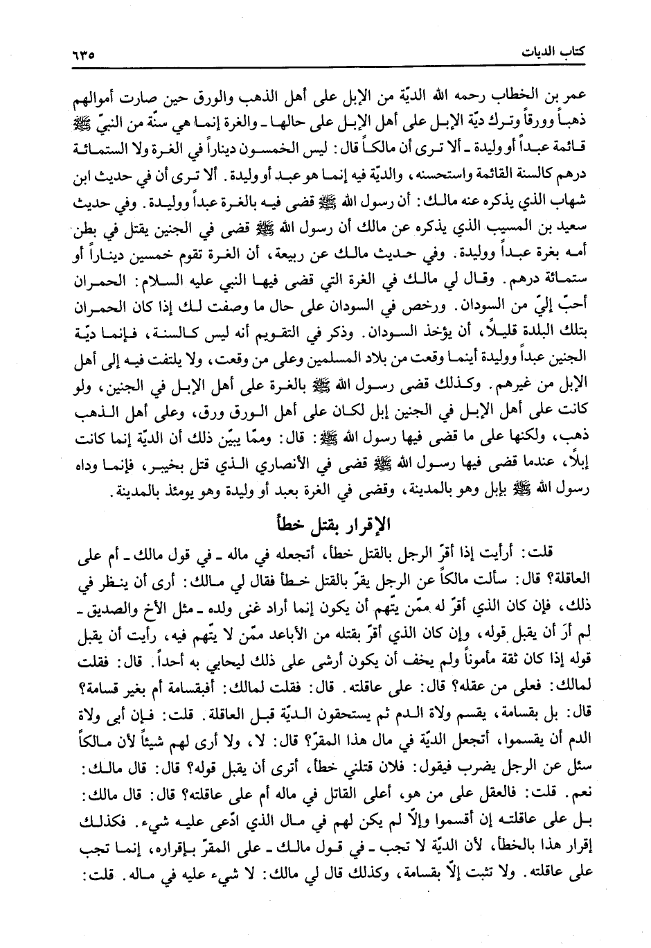 عُمَرُ بْنُ الْخَطَّابِ - رَحِمَهُ اللَّهُ - الدِّيَةَ مِنْ الْإِبِلِ عَلَى أَهْلِ الذَّهَبِ وَالْوَرِقِ حِينَ صَارَتْ. أَمْوَالُهُمْ ذَهَبًا وَوَرِقًا وَتَرَكَ دِيَةَ الْإِبِلِ عَلَى أَهْلِ الْإِبِلِ عَلَى حَالِهَا - وَالْغُرَّةُ إنَّمَا هِيَ سُنَّةٌ مِنْ النَّبِيِّ - صَلَّى اللَّهُ عَلَيْهِ وَسَلَّمَ - قَائِمَةٌ - عَبْدًا أَوْ وَلِيدَةً - أَلَا تَرَى أَنَّ مَالِكًا قَالَ: لَيْسَ الْخَمْسُونَ دِينَارًا فِي الْغُرَّةِ وَلَا السِّتُّمِائَةِ دِرْهَمٍ كَالسُّنَّةِ الْقَائِمَةِ وَاسْتَحْسَنَهُ، وَالدِّيَةُ فِيهِ إنَّمَا هُوَ عَبْدٌ أَوْ وَلِيدَةٌ.
