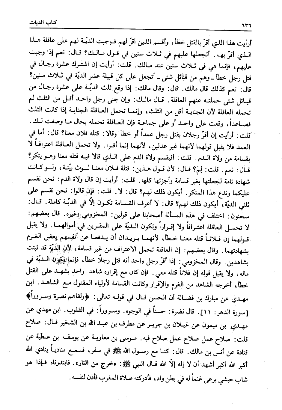 قَالَ سَحْنُونٌ: اخْتَلَفَ فِي هَذِهِ الْمَسْأَلَةِ أَصْحَابُنَا عَلَى قَوْلَيْنِ: الْمَخْزُومِيُّ وَغَيْرُهُ. قَالَ بَعْضُهُمْ: لَا تَحْمِلُ الْعَاقِلَةُ اعْتِرَافًا وَلَا إقْرَارًا وَتَكُونُ الدِّيَةُ عَلَى الْمُقِرَّيْنِ فِي أَمْوَالِهِمَا. وَلَا يُقْبَلُ قَوْلُهُمَا: إنَّ فُلَانًا قَتَلَهُ مَعَنَا خَطَأً؛ لِأَنَّهُمَا يُرِيدَانِ أَنْ يَدْفَعَا عَنْ أَنْفُسِهِمْ بَعْضَ الْغُرْمِ بِشَهَادَتِهِمَا. وَقَالَ بَعْضُهُمْ: إنَّ الْعَاقِلَةَ تَحْمِلُ الِاعْتِرَافَ مِنْ غَيْرِ قَسَامَةٍ؛ لِأَنَّ الدِّيَةَ قَدْ ثَبَتَتْ بِشَاهِدَيْنِ. وَقَالَ الْمَخْزُومِيُّ: إذَا أَقَرَّ رَجُلٌ وَاحِدٌ أَنَّهُ قَتَلَ رَجُلًا خَطَأً، فَإِنَّمَا تَكُونُ الدِّيَةُ فِي مَالِهِ، وَلَا يُقْبَلُ قَوْلُهُ: إنَّ فُلَانًا قَتَلَهُ مَعِي. فَإِنْ كَانَ مَعَ إقْرَارِهِ شَاهِدٌ وَاحِدٌ يَشْهَدُ عَلَى الْقَتْلِ خَطَأً، أَخْرَجَهُ الشَّاهِدُ مِنْ الْغُرْمِ وَالْإِقْرَارِ وَكَانَتْ الْقَسَامَةُ لِأَوْلِيَاءِ الْمَقْتُولِ مَعَ الشَّاهِدِ. ابْنُ مَهْدِيٍّ عَنْ مُبَارَكِ بْنِ فَضَالَةَ أَنَّ الْحَسَنَ قَالَ فِي قَوْله تَعَالَى: {وَلَقَّاهُمْ نَضْرَةً وَسُرُورًا} [الإنسان: 11] سُورَةُ الدَّهْرِ قَالَ: نَضْرَةً: حُسْنًا فِي الْوُجُوهِ. وَسُرُورًا: فِي الْقُلُوبِ.