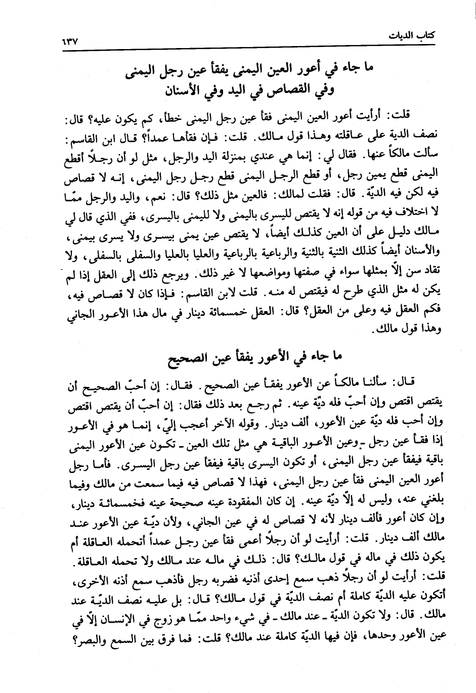 قَالَ ابْنُ الْقَاسِمِ: سَأَلْتُ مَالِكًا عَنْهَا؛ فَقَالَ لِي: إنَّمَا هِيَ عِنْدِي بِمَنْزِلَةِ الْيَدِ وَالرِّجْلِ، مِثْلُ لَوْ أَنَّ رَجُلًا قَطَعَ الْيُمْنَى قَطَعَ يَمِينَ رَجُلٍ، أَوْ قَطَعَ الرِّجْلَ الْيُمْنَى قَطَعَ رِجْلَ رَجُلٍ الْيُمْنَى، إنَّهُ لَا قِصَاصَ فِيهِ لَكِنْ فِيهِ الدِّيَةُ. قَالَ: فَقُلْتُ لِمَالِكٍ: فَالْعَيْنُ مِثْلُ ذَلِكَ؟