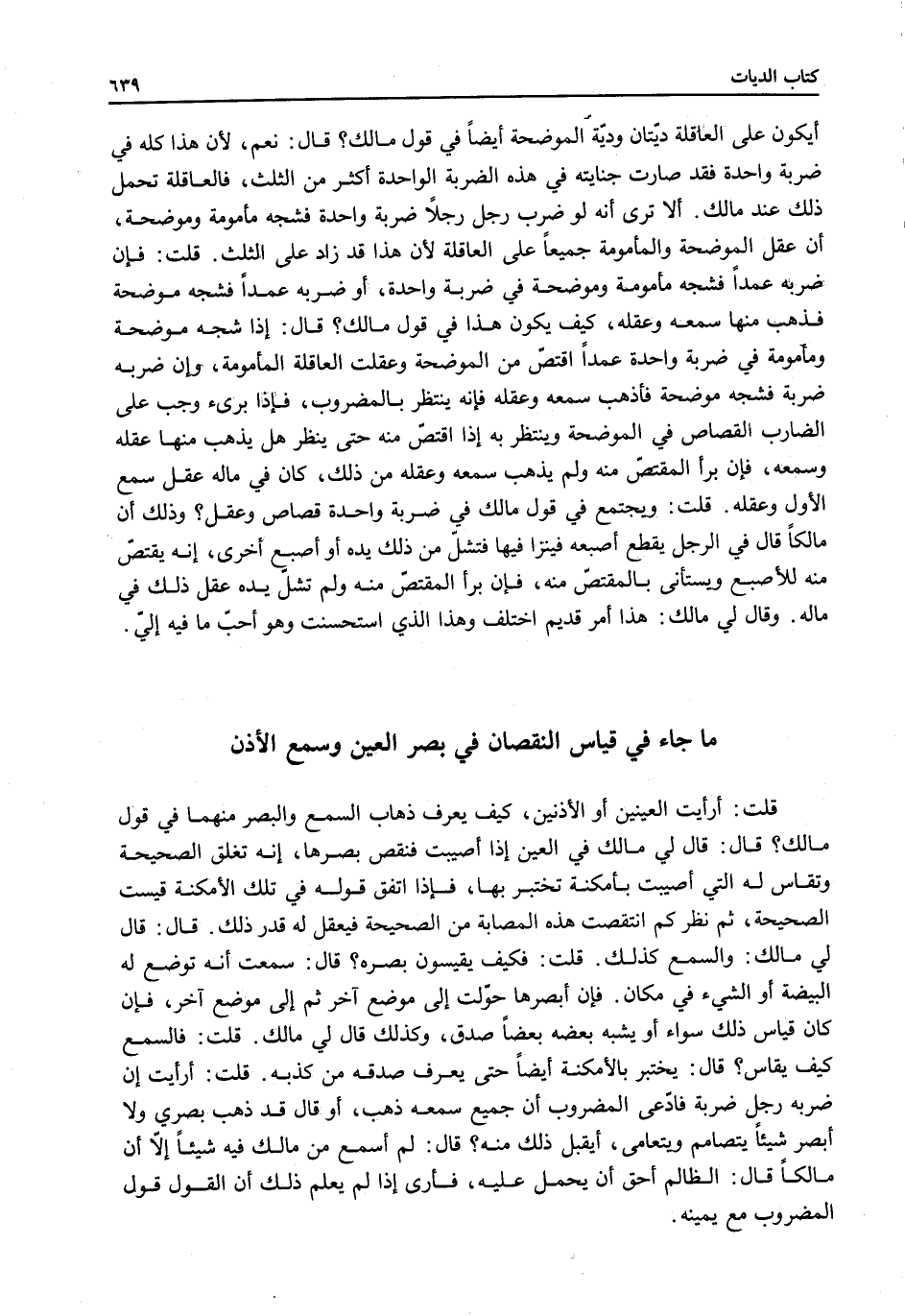 قُلْتُ: أَرَأَيْتَ الْعَيْنَيْنِ أَوْ الْأُذُنَيْنِ، كَيْفَ يُعْرَفُ ذَهَابُ السَّمْعِ وَالْبَصَرِ مِنْهُمَا فِي قَوْلِ مَالِكٍ؟ قَالَ: قَالَ لِي مَالِكٌ فِي الْعَيْنِ إذَا أُصِيبَتْ فَنَقَصَ بَصَرُهَا، إنَّهُ تُغْلَقُ الصَّحِيحَةُ وَتُقَاسُ لَهُ الَّتِي أُصِيبَتْ بِأَمْكِنَةٍ تُخْتَبَرُ بِهَا، فَإِذَا اتَّفَقَ قَوْلُهُ فِي تِلْكَ الْأَمْكِنَةِ قِيسَتْ الصَّحِيحَةُ، ثُمَّ نُظِرَ: كَمْ انْتَقَصَتْ هَذِهِ الْمُصَابَةُ مِنْ الصَّحِيحَةِ فَيَعْقِلُ لَهُ قَدْرَ ذَلِكَ. قَالَ: قَالَ لِي مَالِكٌ: وَالسَّمْعُ كَذَلِكَ.