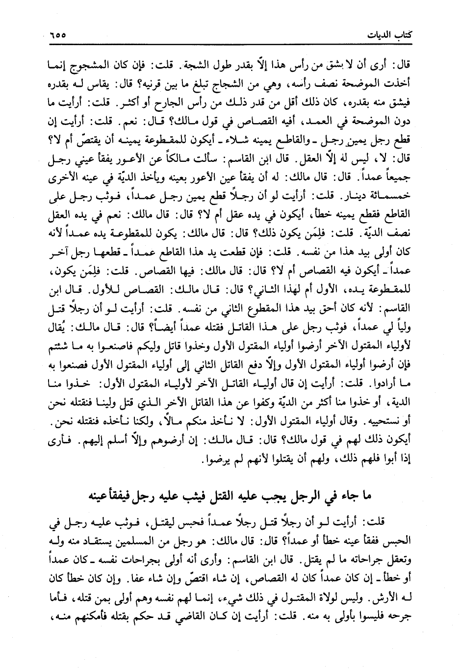 قُلْتُ: أَرَأَيْتَ لَوْ أَنَّ رَجُلًا قَتَلَ رَجُلًا عَمْدًا فَحُبِسَ لِيُقْتَلَ، فَوَثَبَ عَلَيْهِ رَجُلٌ فِي الْحَبْسِ فَفَقَأَ عَيْنَهُ خَطَأً أَوْ عَمْدًا؟ قَالَ: قَالَ مَالِكٌ: هُوَ رَجُلٌ مِنْ الْمُسْلِمِينَ يُسْتَقَادُ مِنْهُ وَلَهُ وَتُعْقَلُ جِرَاحَاتُهُ مَا لَمْ يُقْتَلْ.