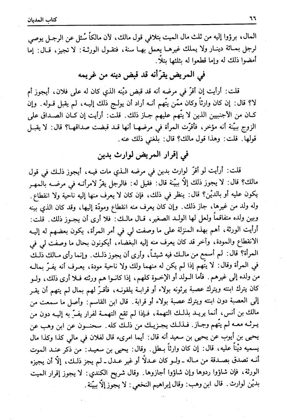 سَحْنُونٌ عَنْ ابْنِ وَهْبٍ عَنْ يَحْيَى بْنِ أَيُّوبَ عَنْ يَحْيَى بْنِ سَعِيدٍ أَنَّهُ قَالَ: أَيُّمَا امْرِئٍ قَالَ لِفُلَانٍ فِي مَالِي كَذَا وَكَذَا مَالٌ يُسَمِّيهِ دَيْنًا عَلَيْهِ، قَالَ: إنْ كَانَ وَارِثًا بَطُلَ. وَقَالَ: يَحْيَى بْنُ سَعِيدٍ: مَنْ ذَكَرَ عِنْدَ الْمَوْتِ أَنَّهُ تَصَدَّقَ بِصَدَقَةٍ مِنْ مَالِهِ وَلَوْ كَانَ عَدْلًا أَوْ غَيْرَ عَدْلٍ لَمْ يَجُزْ ذَلِكَ، إلَّا أَنْ يُجِيزَهُ الْوَرَثَةُ، فَإِنْ شَاءُوا رَدُّوهَا وَإِنْ شَاءُوا أَجَازُوهَا.