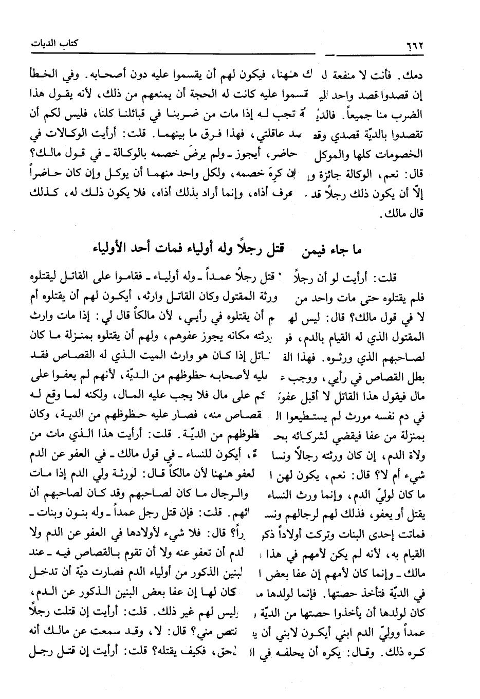 قُلْتُ: أَرَأَيْتَ لَوْ أَنَّ رَجُلًا قَتَلَ رَجُلًا عَمْدًا - وَلَهُ أَوْلِيَاءُ - فَقَامُوا عَلَى الْقَاتِلِ لِيَقْتُلُوهُ فَلَمْ يَقْتُلُوهُ حَتَّى مَاتَ وَاحِدٌ مَنْ وَرَثَةِ الْمَقْتُولِ وَكَانَ الْقَاتِلُ وَارِثَهُ، أَيَكُونُ لَهُمْ أَنْ يَقْتُلُوهُ أَمْ لَا فِي قَوْلِ مَالِكٍ؟