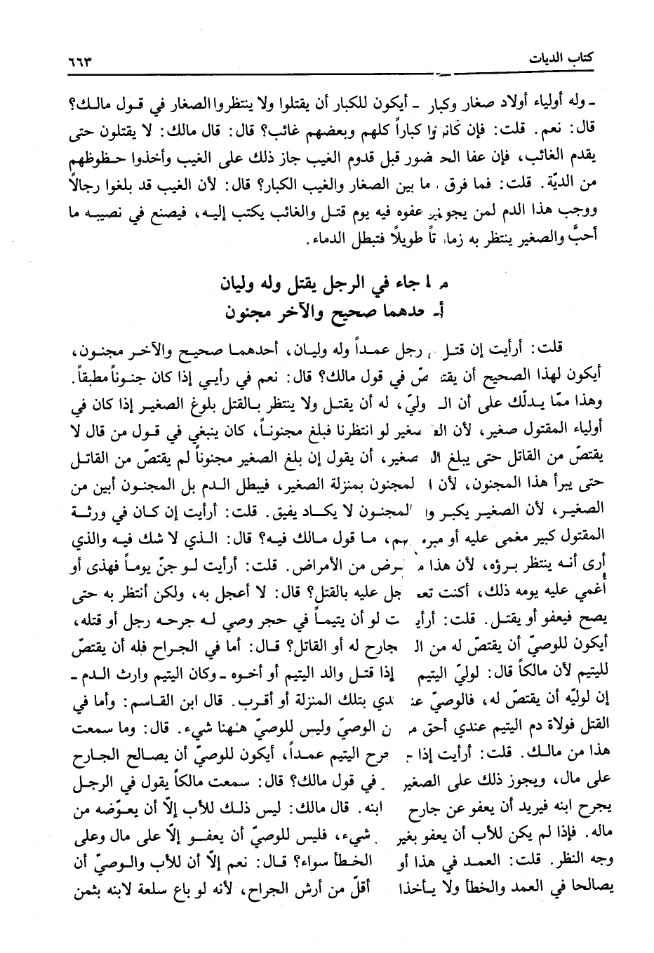 قُلْتُ: أَرَأَيْتَ إنْ قُتِلَ رَجُلٌ عَمْدًا وَلَهُ وَلِيَّانِ، أَحَدُهُمَا صَحِيحٌ وَالْآخَرُ مَجْنُونٌ، أَيَكُونُ لِهَذَا الصَّحِيحِ أَنْ يَقْتَصَّ فِي قَوْلِ مَالِكٍ؟ قَالَ: نَعَمْ فِي رَأْيِي إذَا كَانَ جُنُونًا مُطْبَقًا. وَهَذَا مِمَّا يَدُلُّكَ عَلَى أَنَّ الْوَلِيَّ، لَهُ أَنْ يَقْتُلَ وَلَا يَنْتَظِرَ بِالْقَتْلِ بُلُوغَ الصَّغِيرِ إذَا كَانَ فِي أَوْلِيَاءِ الْمَقْتُولِ صَغِيرٌ؛ لِأَنَّ الصَّغِيرَ لَوْ انْتَظَرْنَا فَبَلَغَ مَجْنُونًا، كَانَ يَنْبَغِي فِي قَوْلِ مَنْ قَالَ لَا يُقْتَصُّ مِنْ الْقَاتِلِ حَتَّى يَبْلُغَ الصَّغِيرُ، أَنْ يَقُولَ إنْ بَلَغَ الصَّغِيرُ مَجْنُونًا لَمْ يُقْتَصَّ مِنْ الْقَاتِلِ حَتَّى يَبْرَأَ هَذَا الْمَجْنُونُ؛ لِأَنَّ الْمَجْنُونَ بِمَنْزِلَةِ الصَّغِيرِ، فَيَبْطُلُ الدَّمُ بَلْ الْمَجْنُونُ أَبْيَنُ مِنْ الصَّغِيرِ؛ لِأَنَّ الصَّغِيرَ يَكْبَرُ وَالْمَجْنُونَ لَا يَكَادُ يُفِيقُ.