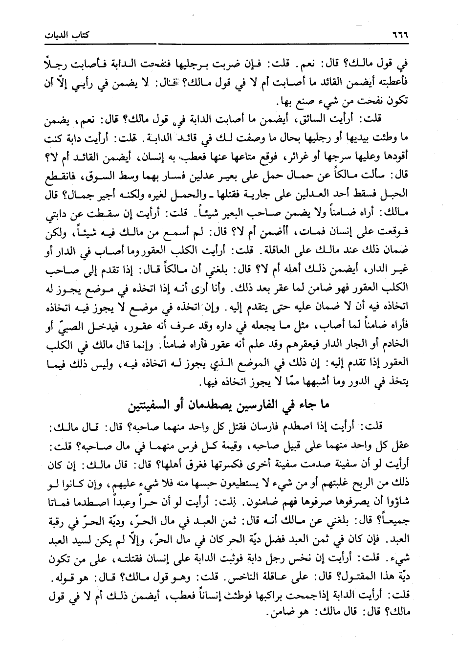 قُلْتُ: أَرَأَيْتَ إنْ سَقَطْتُ عَنْ دَابَّتِي فَوَقَعْتُ عَلَى إنْسَانٍ فَمَاتَ، أَأَضْمَنُ أَمْ لَا؟ قَالَ: لَمْ أَسْمَعْ مِنْ مَالِكٍ فِيهِ شَيْئًا، وَلَكِنْ ضَمَانُ ذَلِكَ عِنْدَ مَالِكٍ عَلَى الْعَاقِلَةِ.
