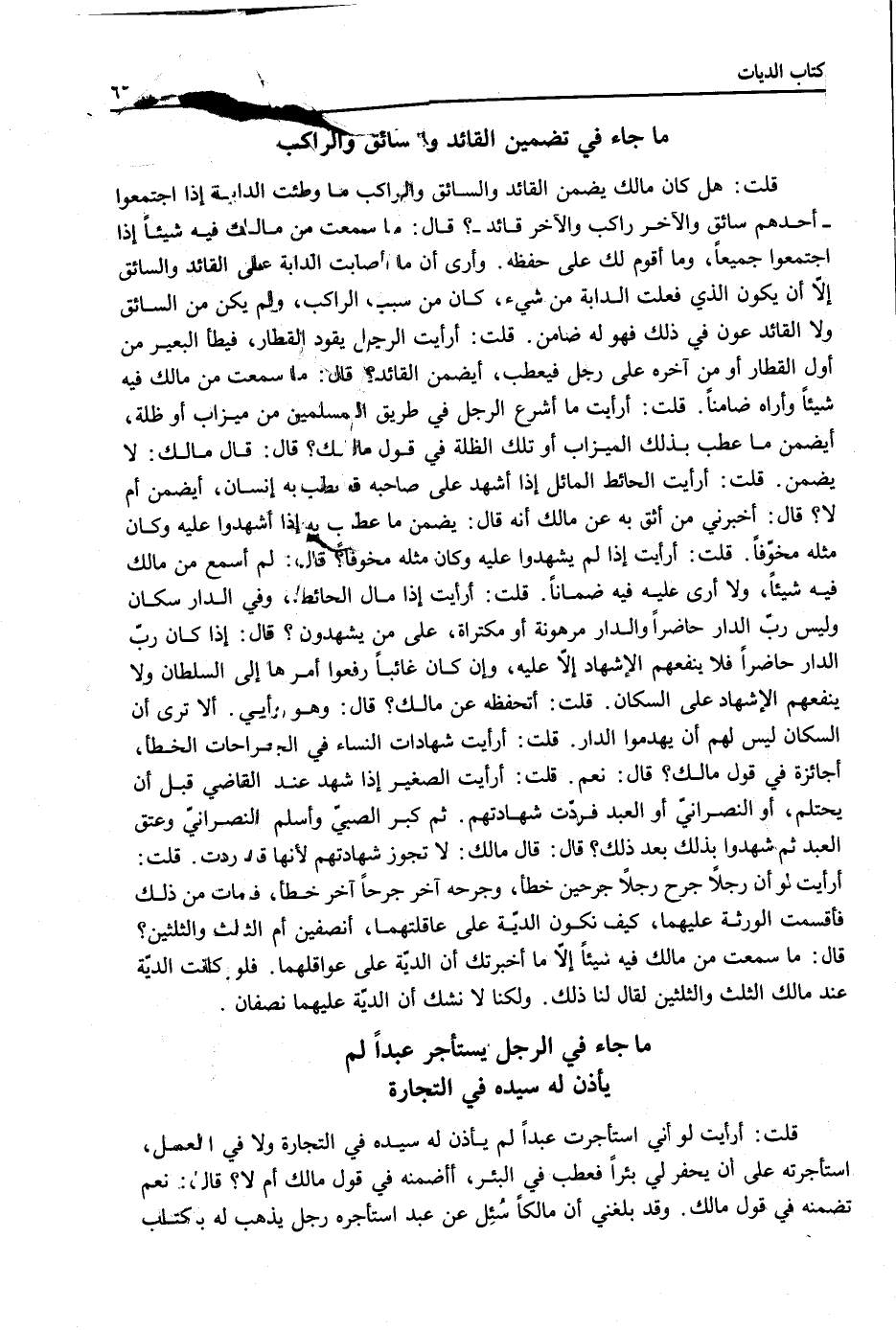 قُلْتُ: أَرَأَيْتَ الرَّجُلَ يَقُودُ الْقِطَارَ، فَيَطَأُ الْبَعِيرُ مِنْ أَوَّلِ الْقِطَارِ أَوْ مِنْ آخِرِهِ عَلَى رَجُلٍ فَيَعْطَبُ، أَيَضْمَنُ الْقَائِدُ؟ قَالَ: مَا سَمِعْتُ مِنْ مَالِكٍ فِيهِ شَيْئًا وَأَرَاهُ ضَامِنًا.
