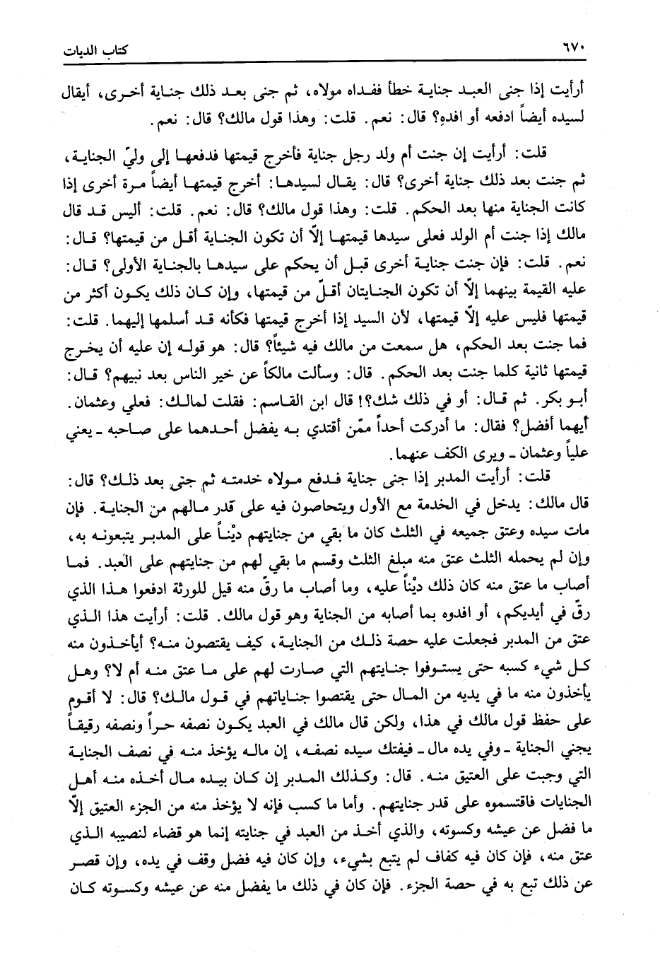 قَالَ: هُوَ قَوْلُهُ إنَّ عَلَيْهِ أَنْ يُخْرِجَ قِيمَتَهَا ثَانِيَةً كُلَّمَا جَنَتْ بَعْدَ الْحُكْمِ. قَالَ: وَسَأَلْت مَالِكًا عَنْ خَيْرِ النَّاسِ بَعْدَ نَبِيِّهِمْ؟ قَالَ: أَبُو بَكْرٍ. ثُمَّ قَالَ: الْوَاشِحِيُّ فِي ذَلِكَ شَكٌّ؟ قَالَ ابْنُ الْقَاسِمِ: فَقُلْتُ لِمَالِكٍ: فَعَلِيٌّ وَعُثْمَانُ. أَيُّهُمَا أَفْضَلُ؟ فَقَالَ: مَا أَدْرَكْتُ أَحَدًا مِمَّنْ أَقْتَدِي بِهِ يُفَضِّلُ أَحَدَهُمَا عَلَى صَاحِبِهِ - يَعْنِي عَلِيًّا وَعُثْمَانَ - وَيَرَى الْكَفَّ عَنْهُمَا.