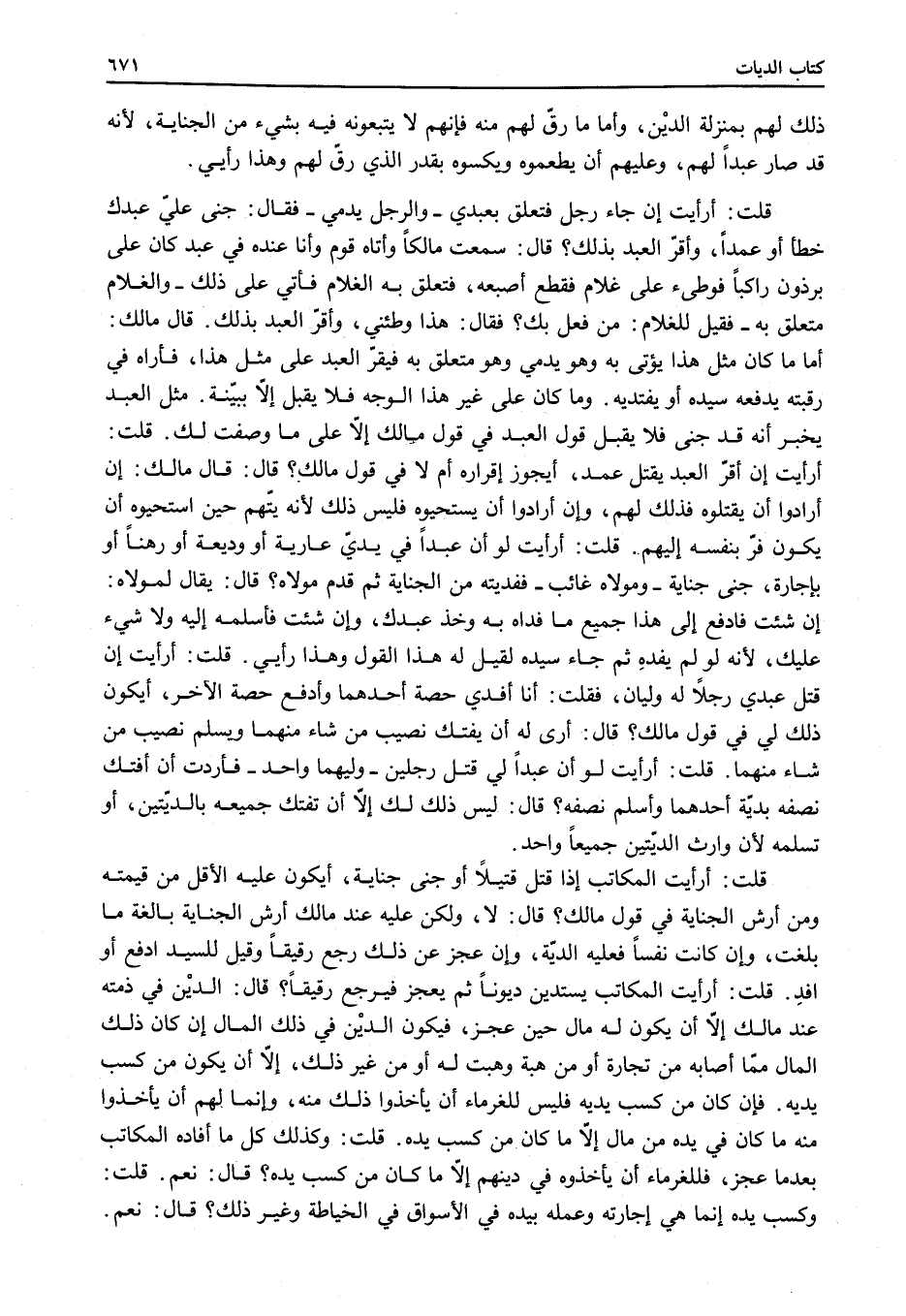 قُلْتُ: أَرَأَيْتَ لَوْ أَنَّ عَبْدًا لِي قَتَلَ رَجُلَيْنِ - وَلِيُّهُمَا وَاحِدٌ - فَأَرَدْتُ أَنْ أَفْتَكَّ نِصْفَهُ بِدِيَةِ أَحَدِهِمَا وَأُسْلِمَ نِصْفَهُ؟ قَالَ: لَيْسَ ذَلِكَ لَكَ إلَّا أَنْ تَفْتَكَّ جَمِيعَهُ بِالدِّيَتَيْنِ، أَوْ تُسْلِمَهُ لِأَنَّ وَارِثَ الدِّيَتَيْنِ جَمِيعًا وَاحِدٌ.
