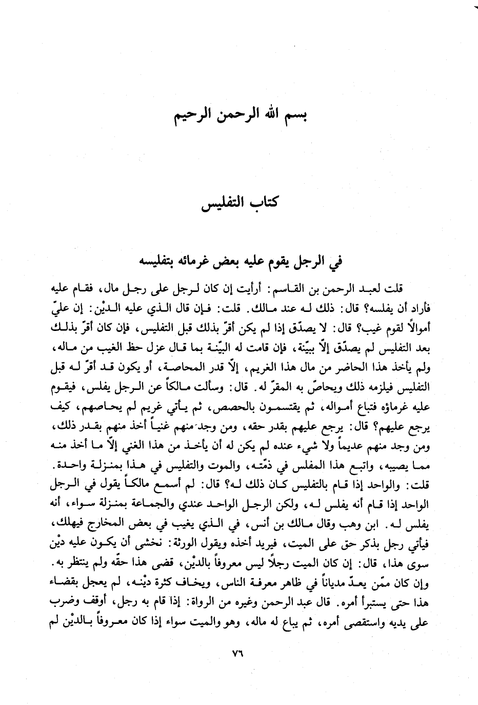 ِ فِي الرَّجُلِ يَقُومُ عَلَيْهِ بَعْضُ غُرَمَائِهِ بِتَفْلِيسِهِ قُلْت لِعَبْدِ الرَّحْمَنِ بْنِ الْقَاسِمِ: أَرَأَيْتَ إنْ كَانَ لِرَجُلٍ عَلَى رَجُلٍ مَالٌ، فَقَامَ عَلَيْهِ فَأَرَادَ أَنْ يُفَلِّسَهُ؟