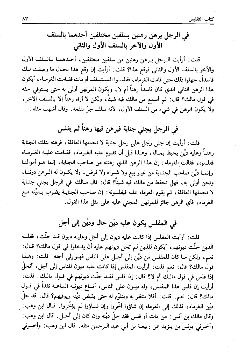 ٍ قُلْتُ: أَرَأَيْتَ الْمُفْلِسَ إذَا كَانَتْ عَلَيْهِ دُيُونٌ إلَى أَجَلٍ وَعَلَيْهِ دُيُونٌ قَدْ حَلَّتْ، فَفَلَّسَهُ الَّذِينَ حَلَّتْ دُيُونُهُمْ، أَيَكُونُ لِلَّذِينَ لَمْ تَحِلَّ دُيُونُهُمْ عَلَيْهِ أَنْ يَدْخُلُوا فِي قَوْلِ مَالِكٍ؟