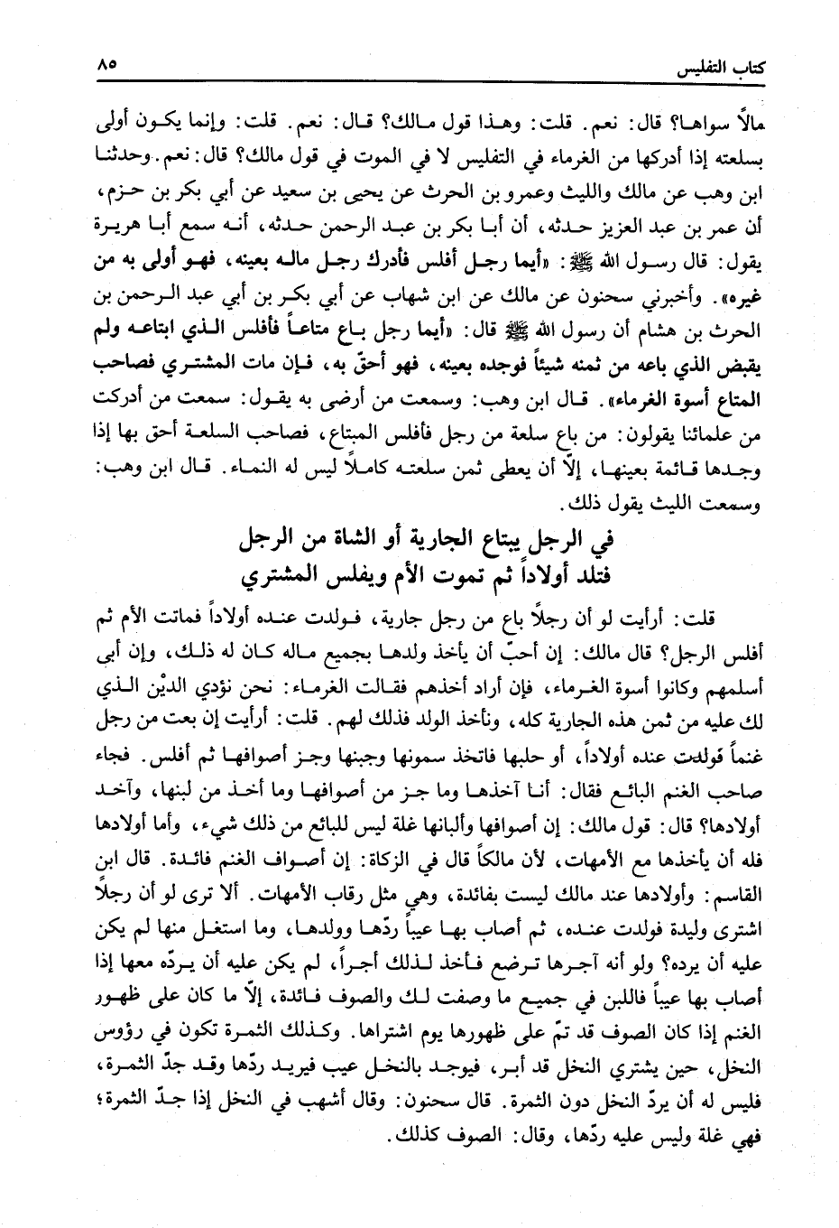 قُلْتُ: أَرَأَيْتَ إنْ بِعْتُ مِنْ رَجُلٍ غَنَمًا فَوَلَدَتْ عِنْدَهُ أَوْلَادًا، أَوْ حَلَبَهَا فَاتَّخَذَ سُمُونَهَا وَجُبْنَهَا وَجَزَّ أَصْوَافَهَا ثُمَّ أَفْلَسَ. فَجَاءَ صَاحِبُ الْغَنَمِ الْبَائِعَ فَقَالَ: أَنَا آخُذُهَا وَمَا جُزَّ مَنْ أَصْوَافِهَا وَمَا أُخِذَ مِنْ لَبَنِهَا، وَآخُذُ أَوْلَادَهَا؟