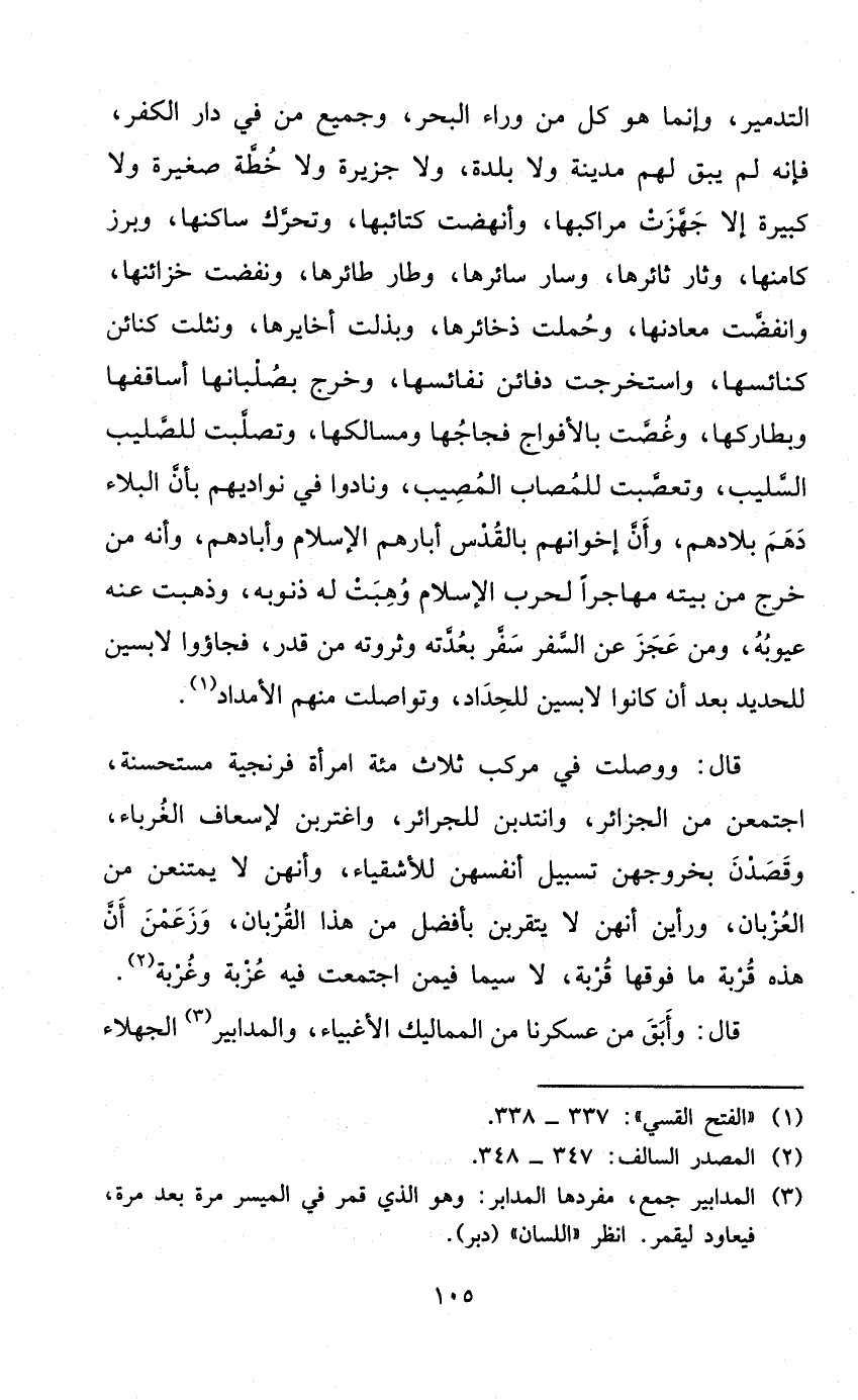 التدمير وَإِنَّمَا هُوَ كل من وَرَاء الْبَحْر وَجَمِيع من فِي دَار الْكفْر فَإِنَّهُ لم يبْق لَهُم مَدِينَة وَلَا بَلْدَة وَلَا جَزِيرَة وَلَا خطة صَغِيرَة وَلَا كَبِيرَة إِلَّا جهزت مراكبها وأنهضت كتائبها وتحرك ساكنها وبرز كامنها وثار ثائرها وَسَار سائرها وطار طائرها ونفضت خزائنها وانفضت معادنها وحملت ذخائرها وبذلت أخايرها ونثلت كنائن كنائسها واستخرجت دفائن نفائسها وَخرج يصلبانهم أساقفها وبطاركها وغصت بالأفواج فجاجها ومسالكها وتصلبت للصليب السليب وتعصبت للمصاب الْمُصِيب وَنَادَوْا فِي نواديهم بِأَن الْبلَاء دهم بِلَادهمْ وَأَن إخْوَانهمْ بالقدس أبارهم الْإِسْلَام وأبادهم وَأَنه من خرج من بَيته مُهَاجرا لِحَرْب الْإِسْلَام وهبت لَهُ ذنُوبه وَذَهَبت عَنهُ عيوبه وَمن عجز عَن السّفر سفر بعدته وثروته من قدر فجاؤوا لابسين للحديد بعد أَن كَانُوا لابسين للحداد وتواصلت مِنْهُم الأمداد