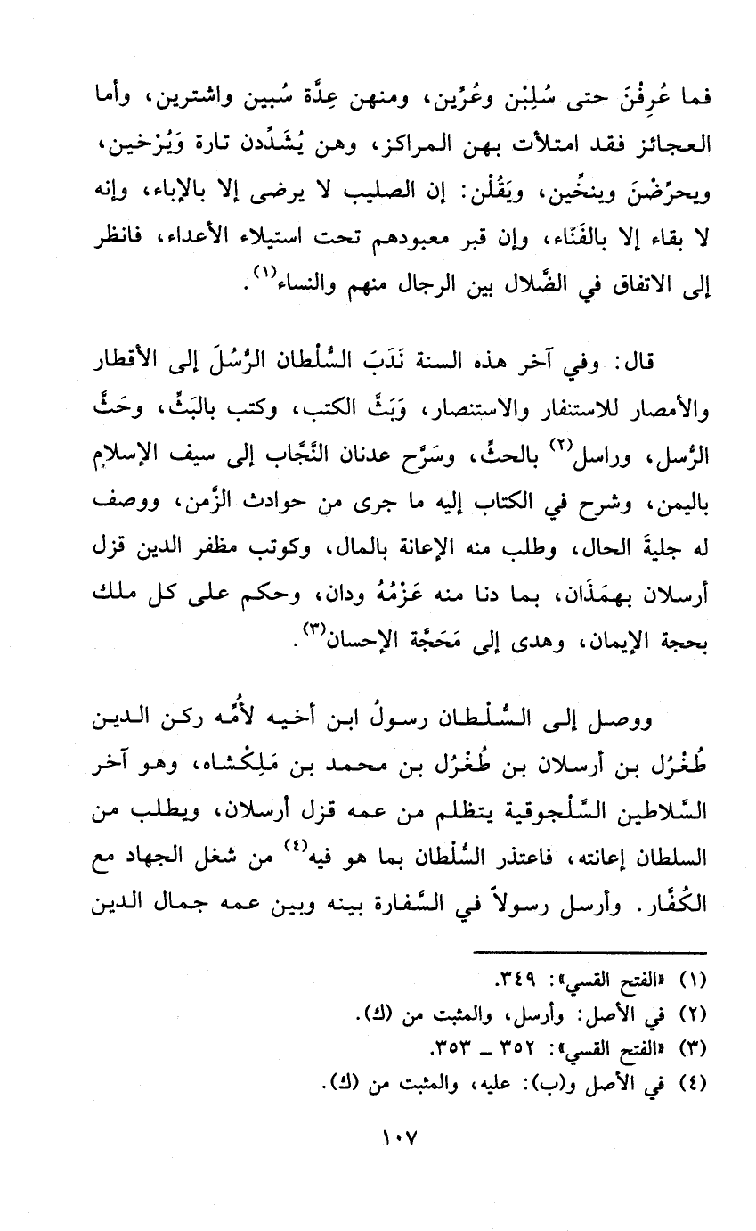 قَالَ وَفِي آخر هَذِه السّنة ندب السُّلْطَان الرُّسُل إِلَى الأقطار والأمصار للاستنفار والاستنصار وَبث الْكتب وَكتب بالبث وحث الرُّسُل وراسل بالحث وسرح عدنان النجاب إِلَى سيف الْإِسْلَام بِالْيمن وَشرح فِي الْكتاب إِلَيْهِ مَا جرى من حوادث الزَّمن وَوصف لَهُ جلية الْحَال وَطلب مِنْهُ الاعانة بِالْمَالِ وكوتب مظفر الدّين قزل أرسلان بهمذان بِمَا دنا مِنْهُ عزمه ودان وَحكم على كل ملك بِحجَّة الايمان وَهدى إِلَى محجة الاحسان