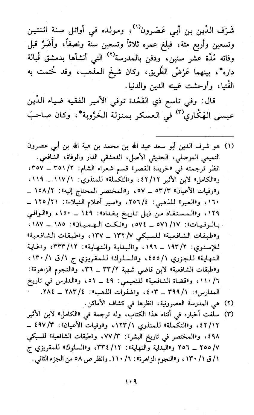 شرف الدّين بن أبي عصرون ومولده فِي أَوَائِل سنة اثْنَتَيْنِ وَتِسْعين وَأَرْبع مئة فَبلغ عمره ثَلَاثًا وَتِسْعين سنة وَنصفا وأضر قبل وَفَاته مُدَّة عشر سِنِين وَدفن بِالْمَدْرَسَةِ الَّتِي أَنْشَأَهَا بِدِمَشْق قبالة دَاره بَينهمَا عرض الطَّرِيق وَكَانَ شيخ الْمَذْهَب وَقد ختمت بِهِ الْفتيا وأوحشت غيبته الدّين وَالدُّنْيَا