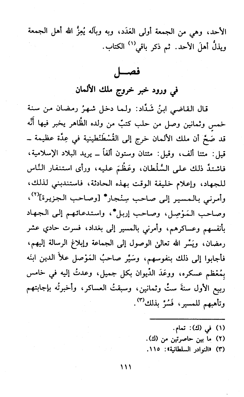 قَالَ القَاضِي ابْن شَدَّاد وَلما دخل شهر رَمَضَان من سنة خمس وَثَمَانِينَ وصل من حلب كتب من وَلَده الظَّاهِر يخبر فِيهَا أَنه قد صَحَّ أَن ملك الألمان خرج إِلَى الْقُسْطَنْطِينِيَّة فِي عدَّة عَظِيمَة - قيل مئتا ألف وَقيل مئتان وَسِتُّونَ ألفا - يُرِيد الْبِلَاد الإسلاميه فَاشْتَدَّ ذَلِك على السُّلْطَان وَعظم عَلَيْهِ وَرَأى استنفار النَّاس للْجِهَاد وإعلام خَليفَة الْوَقْت بِهَذِهِ الحادثه فاستندبني لذَلِك وَأَمرَنِي بِالْمَسِيرِ إِلَى صَاحب سنجار وَصَاحب الجزيرة وَصَاحب الْموصل وَصَاحب إربل واستدعائهم إِلَى الْجِهَاد بِأَنْفسِهِم وعساكرهم وَأَمرَنِي بِالْمَسِيرِ إِلَى بَغْدَاد فسرت حادي عشر رَمَضَان وَيسر الله تَعَالَى الْوُصُول إِلَى الْجَمَاعَة وإبلاغ الرسَالَة إِلَيْهِم فَأَجَابُوا إِلَى ذَلِك بنفوسهم وسير صَاحب الْموصل علأ الدّين ابْنه بمعظم عسكره ووعد الدِّيوَان بِكُل جميل وعدت إِلَيْهِ فِي خَامِس ربيع الأول سنة سِتّ وَثَمَانِينَ وسبقت العساكر وأخبرته بإجابتهم وتأهبهم للمسير فسر بذلك